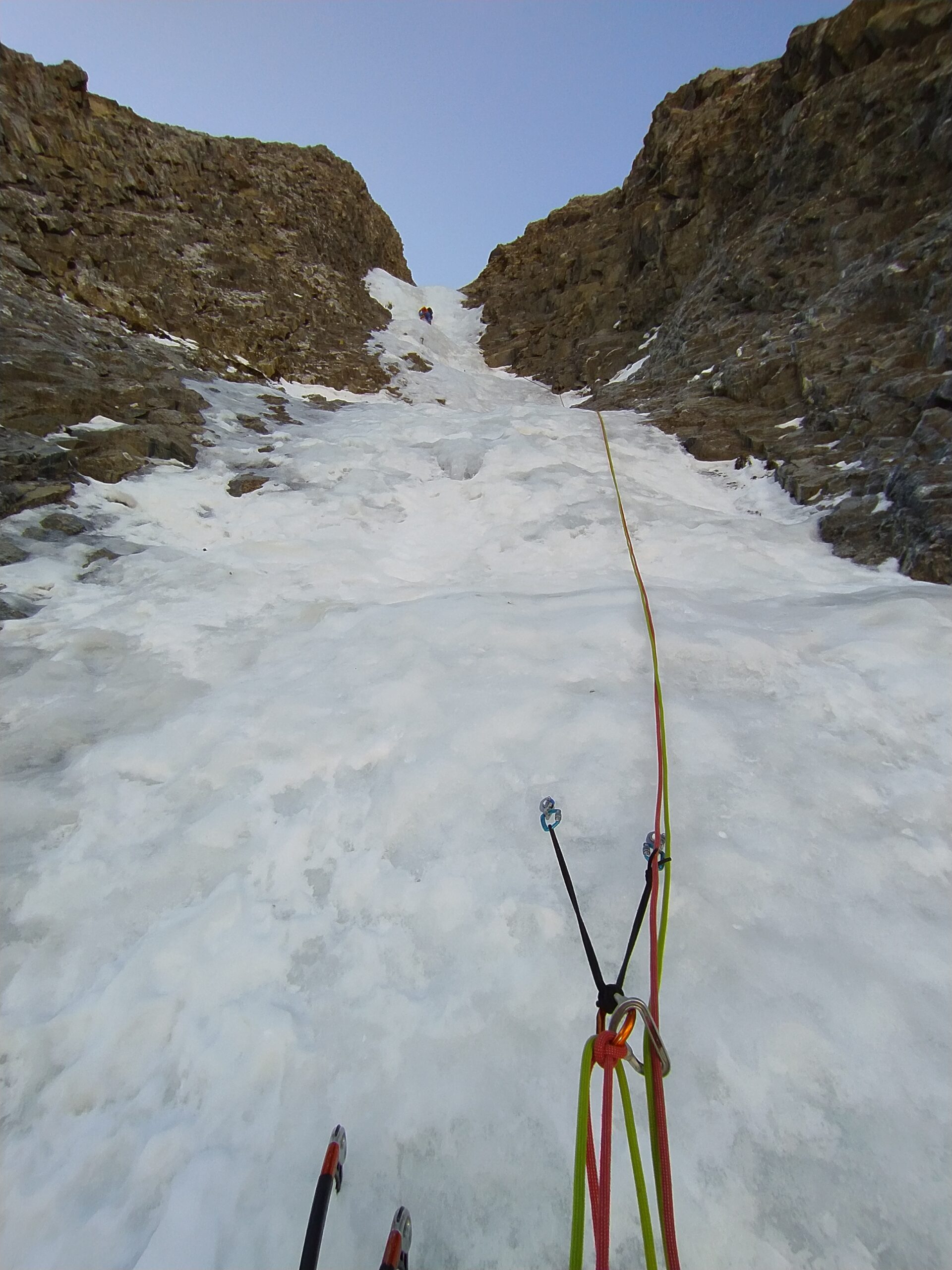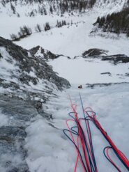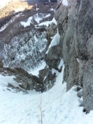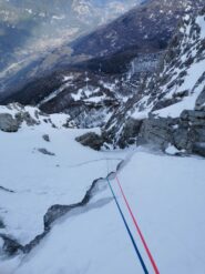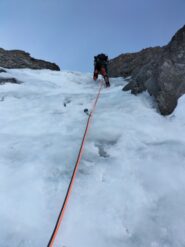 Raggiunta la base, si sale il primo risalto ghiacciato (aggirabile a dx se non formato). Sosta a chiodi e cordoni poco sopra sulla dx (da verificare).