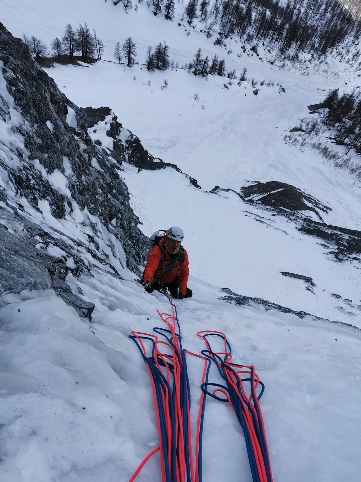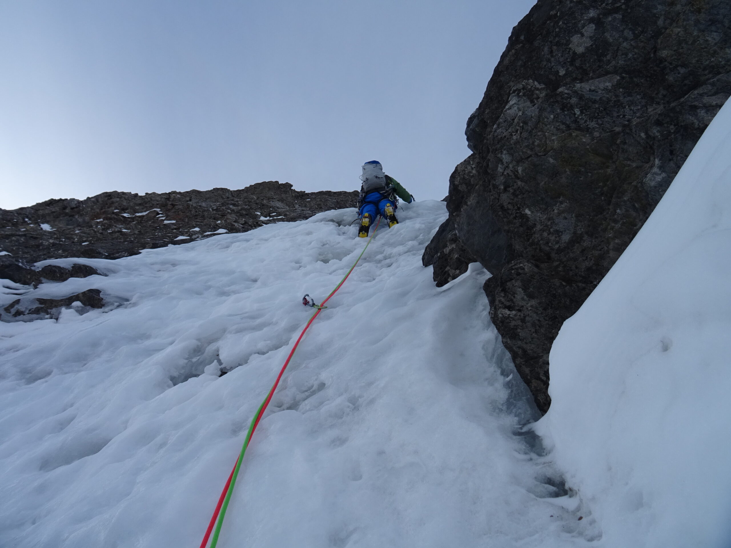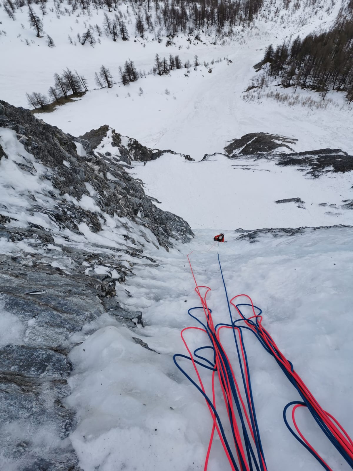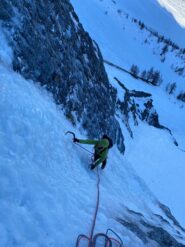 MATERIALE: 10 viti da ghiaccio (utili tutte corte, se non quelle di sosta), friends 0.2- 2, un paio di chiodi da roccia.