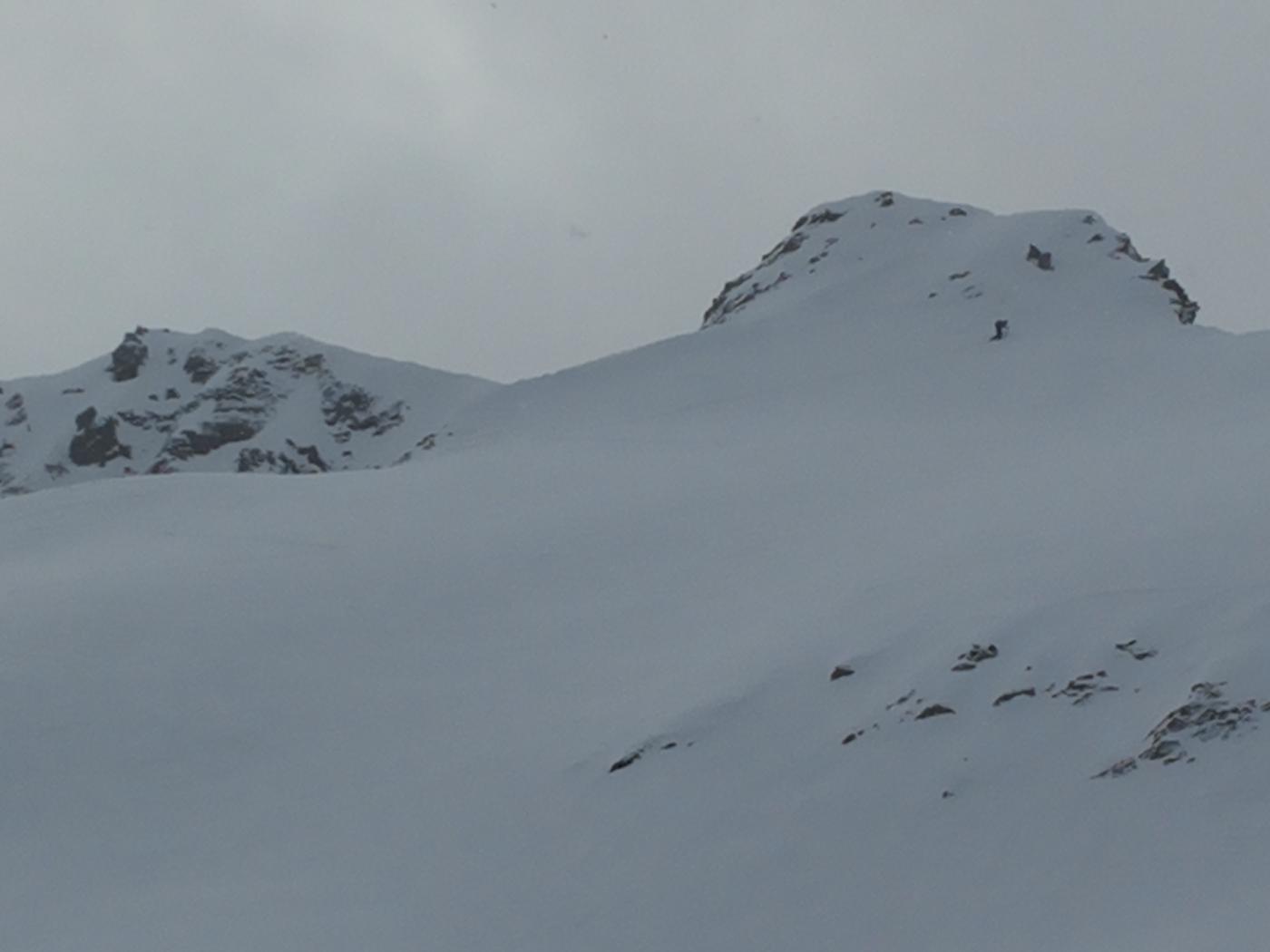 Si raggiunge la spalla verso Q. 2400, di qui traversando ripidi pendii si raggiunge il catino sommitale da cui si vede la vetta.