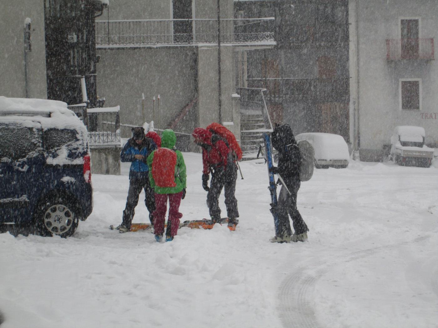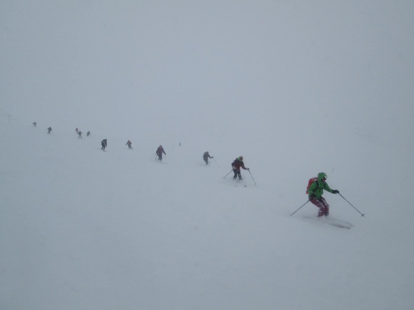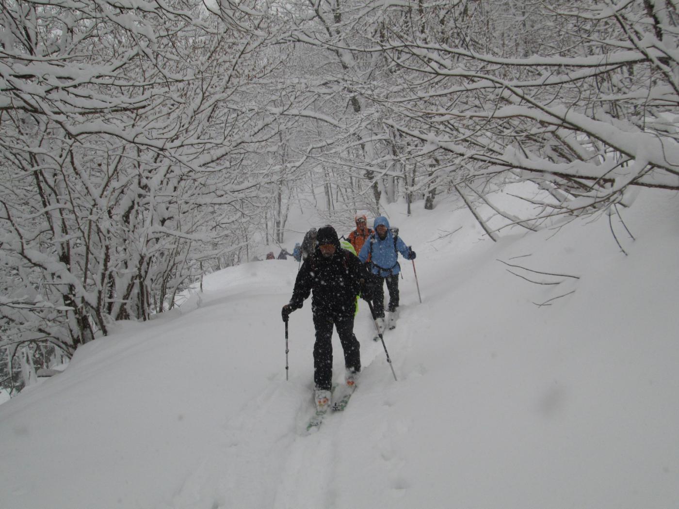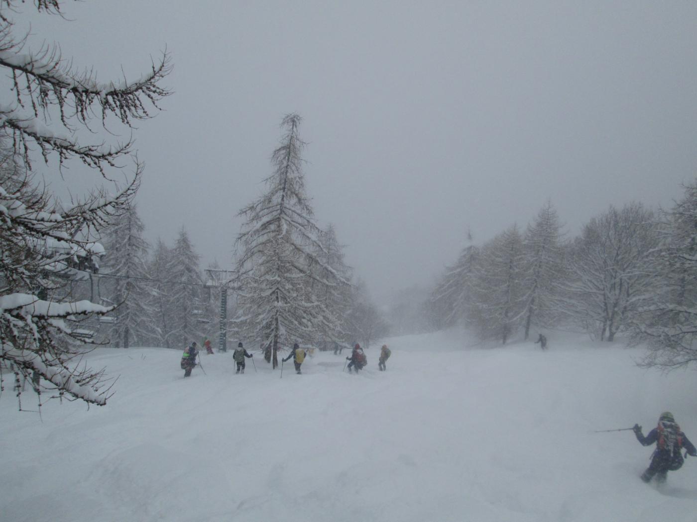 Seconda giornata della gita sociale di 2 giorni del CAI Pianezza, 25 partecipanti. Gita ovviamente di ripiego fatta interamente sotto una fittissima e copiosa nevicata. A Crissolo alle 9 del mattino c’erano già 25-30 cm di neve fresca; abbiamo parcheggiato in paese ed essendo in tanti abbiamo preferito evitare di risalire le piste, così abbiamo seguito la stradina che parte dalla Spiaggia salendo fino a Pian Giasset. La stradina è lunga ma l’ambiente incantato l’ha resa meno noiosa. Da qui abbiamo risalito il bel Vallone delle Contesse, visto che l’intenzione era di scendere da qui…davanti a noi erano passati da poco 2 scialpinisti e quindi ci siamo trovati una bella e comoda traccia, che ci ha evitato di dover tribolare a individuare la direzione corretta nella nebbia. Arrivati agli impianti, abbiamo optato per proseguire fino al Granè, anche perché nel frattempo gli skilift erano stati chiusi e quindi avevamo le piste tutte per noi. Arrivati in cima verso le 12,30, panorama nullo e quindi siamo scesi rapidamente al bar (chiuso) sotto la cima. Discesa iniziata alle 13, abbiamo deciso di rinunciare alla discesa nel Vallone delle Contesse, sia per la scarsa visibilità, sia perché con tutta quella neve (in alto almeno 60-70 cm) rischiavamo di dover spingere per gran parte della discesa…quindi discesa lungo le piste deserte e tutte per noi…bellissima ed entusiasmante, una quantità di neve incredibile…se si provava a uscire di pista dopo pochi metri ci si trovava immersi fin sopra il ginocchio…bellissimo anche il tratto nel bosco sotto la seggiovia, un po’ stretto e movimentato ma con questa neve tutto diventa uno spettacolo…