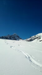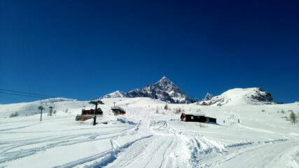 Bella neve, nonostante l’alta temperatura e i molti sciatori già passati c’è ancora del terreno libero per divertenti serpentine. Salito tagliando la stradina nel bosco su una traccia sostenuta e con parecchi cambi di direzione. Sceso sul vecchio pistone che purtroppo arriva in mezzo alle case un po’ in basso rispetto alla seggiovia.