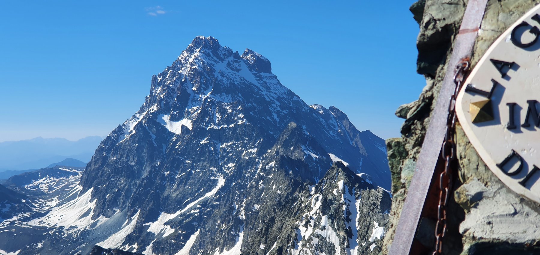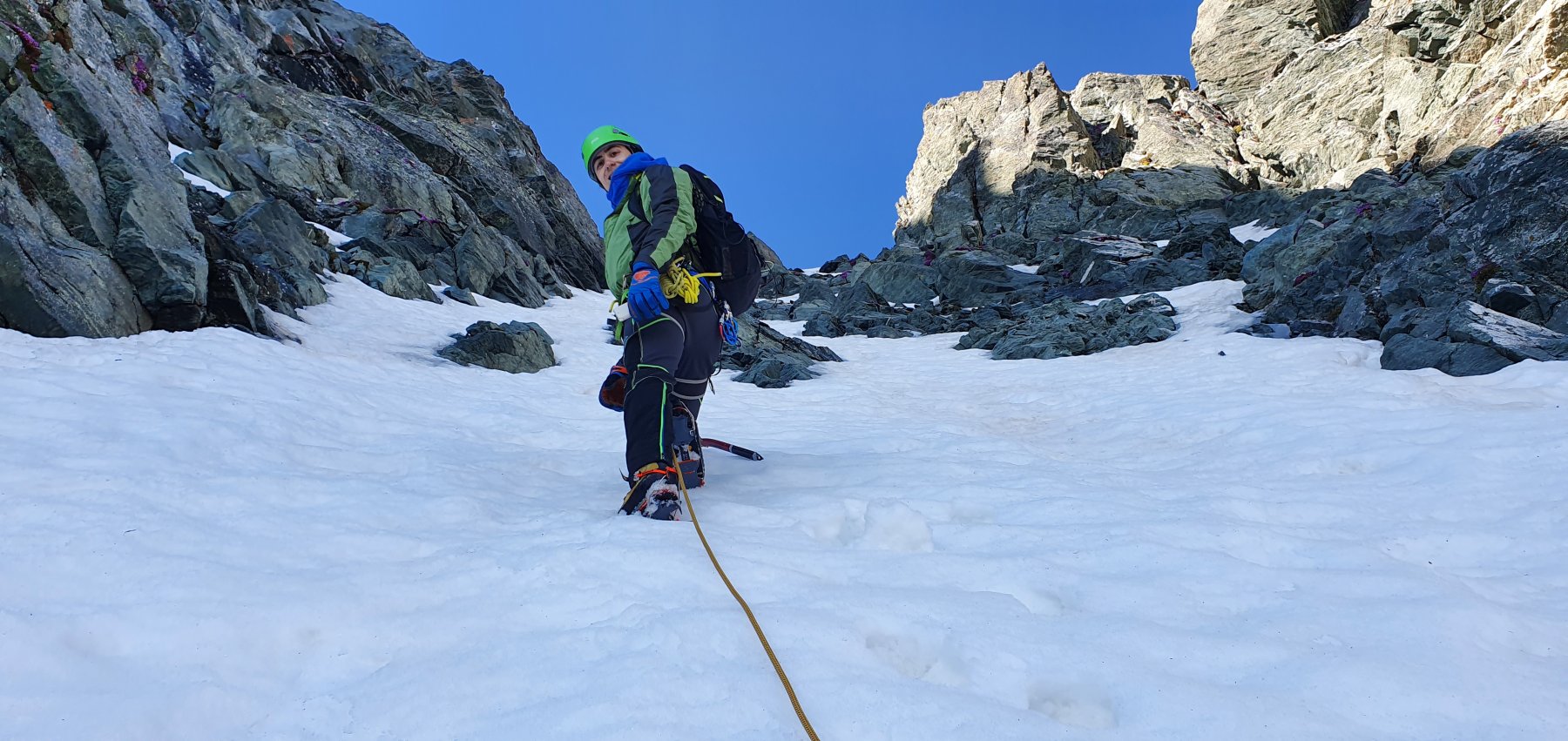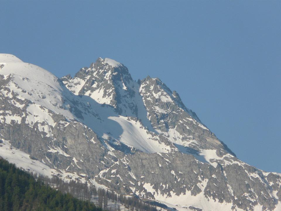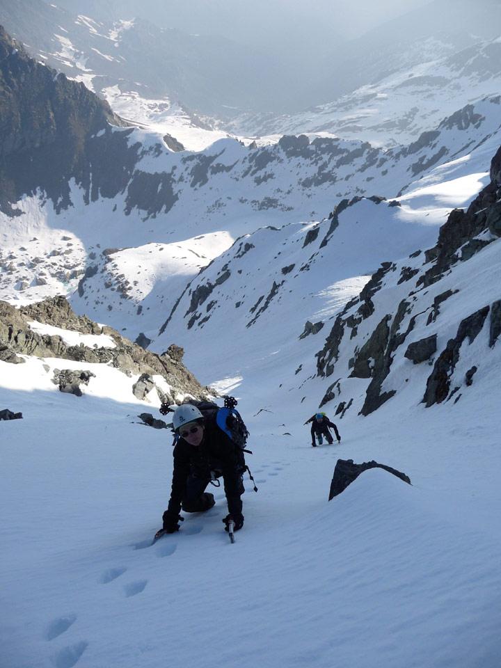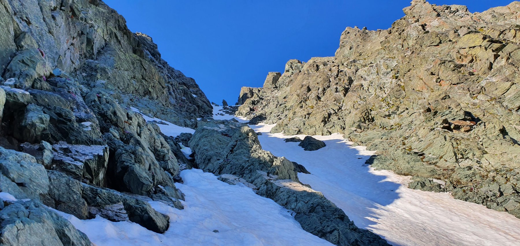 Risalire il ripido pendio successivo (150 m a 40 gradi) che in alto si trasforma in canale (250 m a 45 gradi, max 50° negli ultimi 50 metri) e raggiungere un colletto sulla cresta NO del Granero con un caratteristico monolito roccioso a forma di dente. Dal colletto attaccare verso sx l’ampia cresta sulla sua dx seguendo una serie di cenge e rampe prima verso sx poi verso dx quindi nuovamente verso sx fino a rimontare un camino di rocce rotte che porta alla base di un gendarme (passi di II/II+ a seconda del passaggio prescelto, roccia non sembre stabile). Contornare il gendarme sul lato NE (resti di un ricovero) quindi raggiungere l’arrotondata cima NO coperta da un calotta nevosa fino a inizio stagione. In breve, traversato un colletto (dove perviene il canale est) si tocca la cima principale con la statua della Madonna.