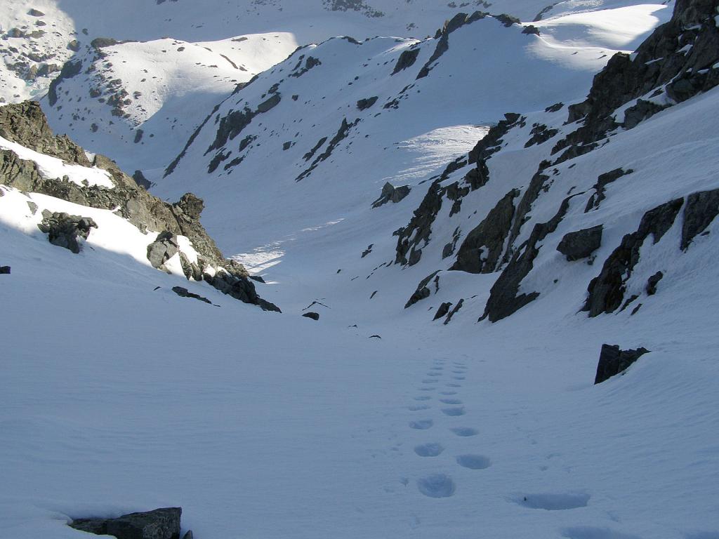 2° giorno: salita: dal Rifugio con un traverso verso ESE raggiungere la piana a monte del lago Lungo (massi erratici), rimontare un ripido canale al suo fondo, quindi piegare verso SE e raggiungere una conca pianeggiante alla base del canale (in caso di scarso innevamento seguire il sentiero per il col Manzol e raggiunto il Lago Nero piegare a S e raggiunge la conca sopracitata).