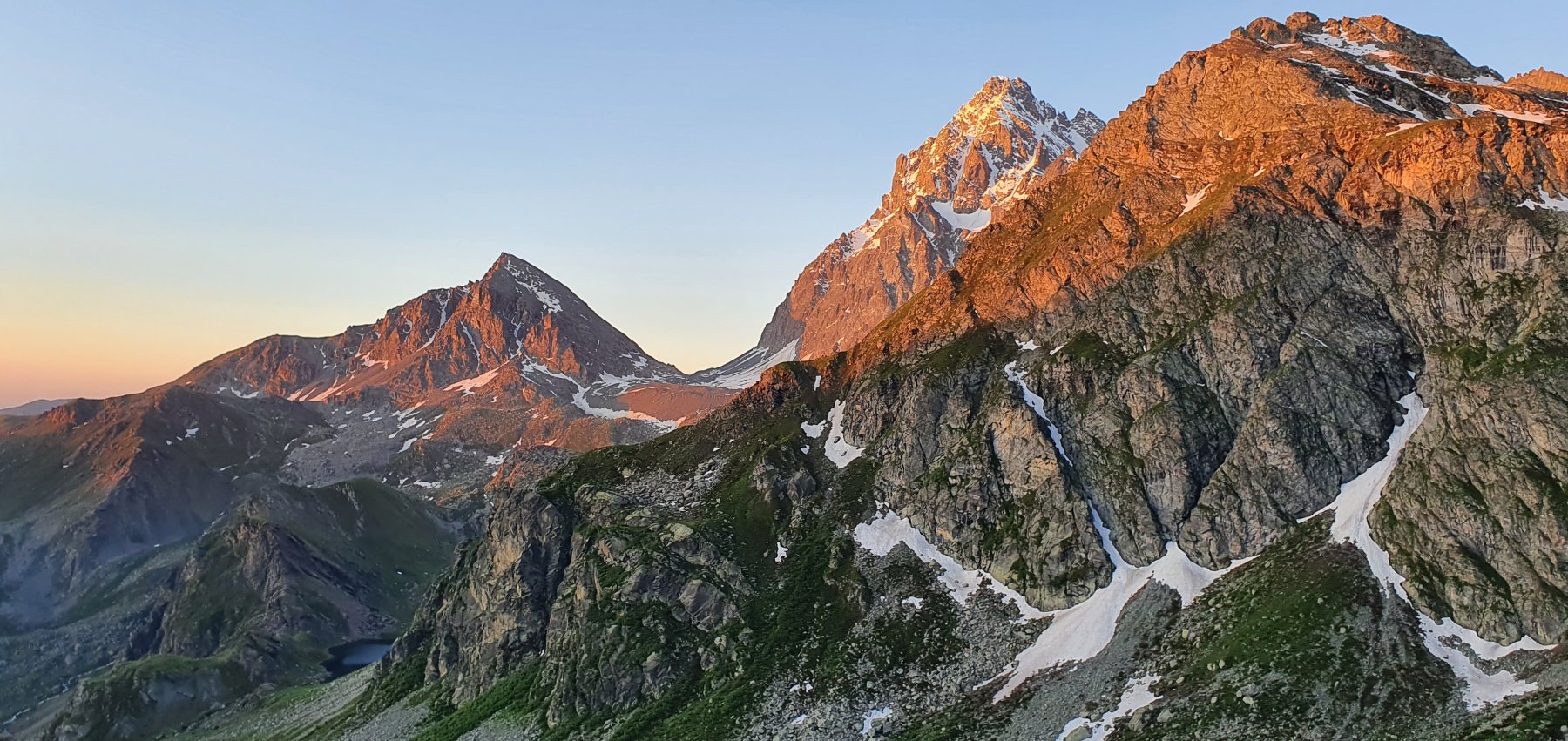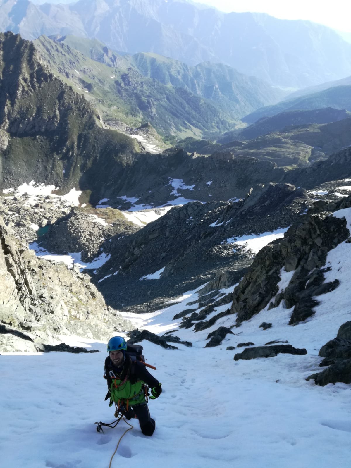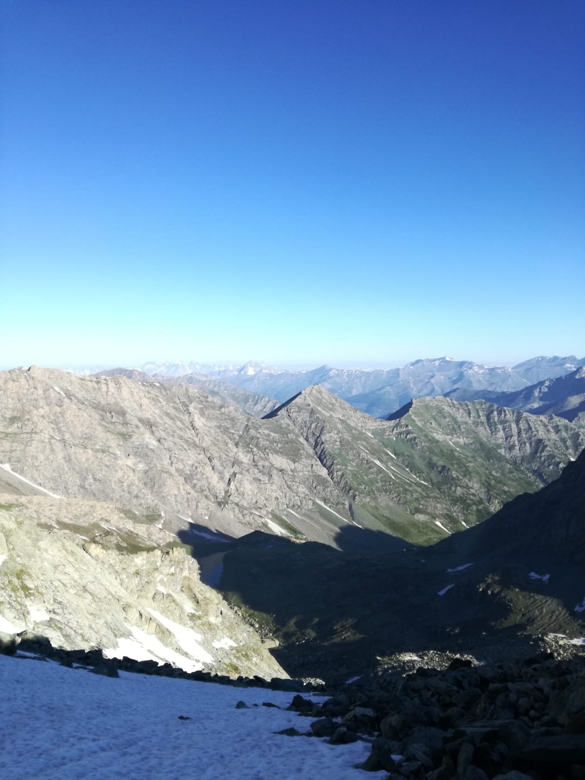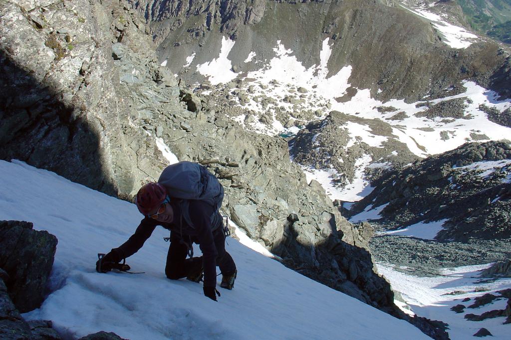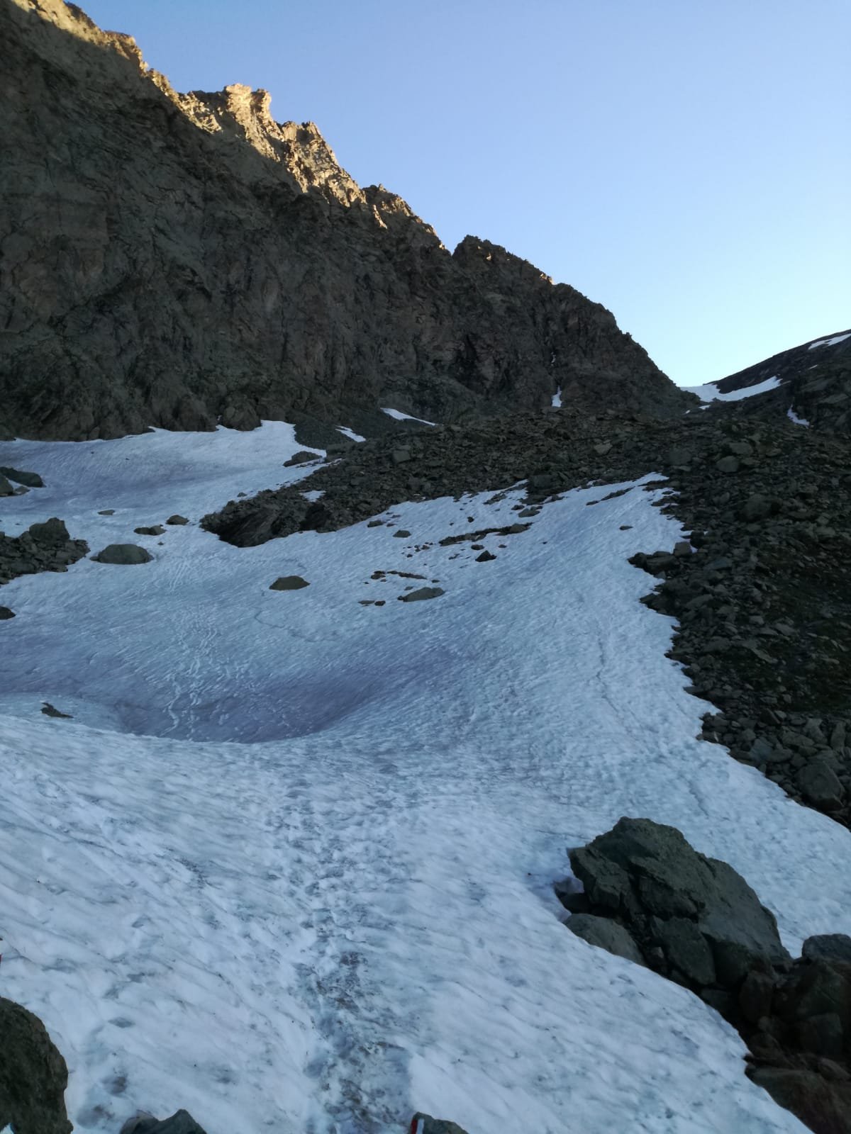 Discesa: scendere per la via normale della Val Pellice, che segue il canale SO e che fino a inizio stagione può presentarsi anche completamente innevato (in questo caso 250 m a 40-45 gradi). Se non c’è riferimento del percorso estivo, costeggiare la cresta di confine quindi imboccare un valloncello verso NO che scende sul Lago Lungo (attenzione al traverso finale se completamente innevato), da dove in breve si torna al bivacco.