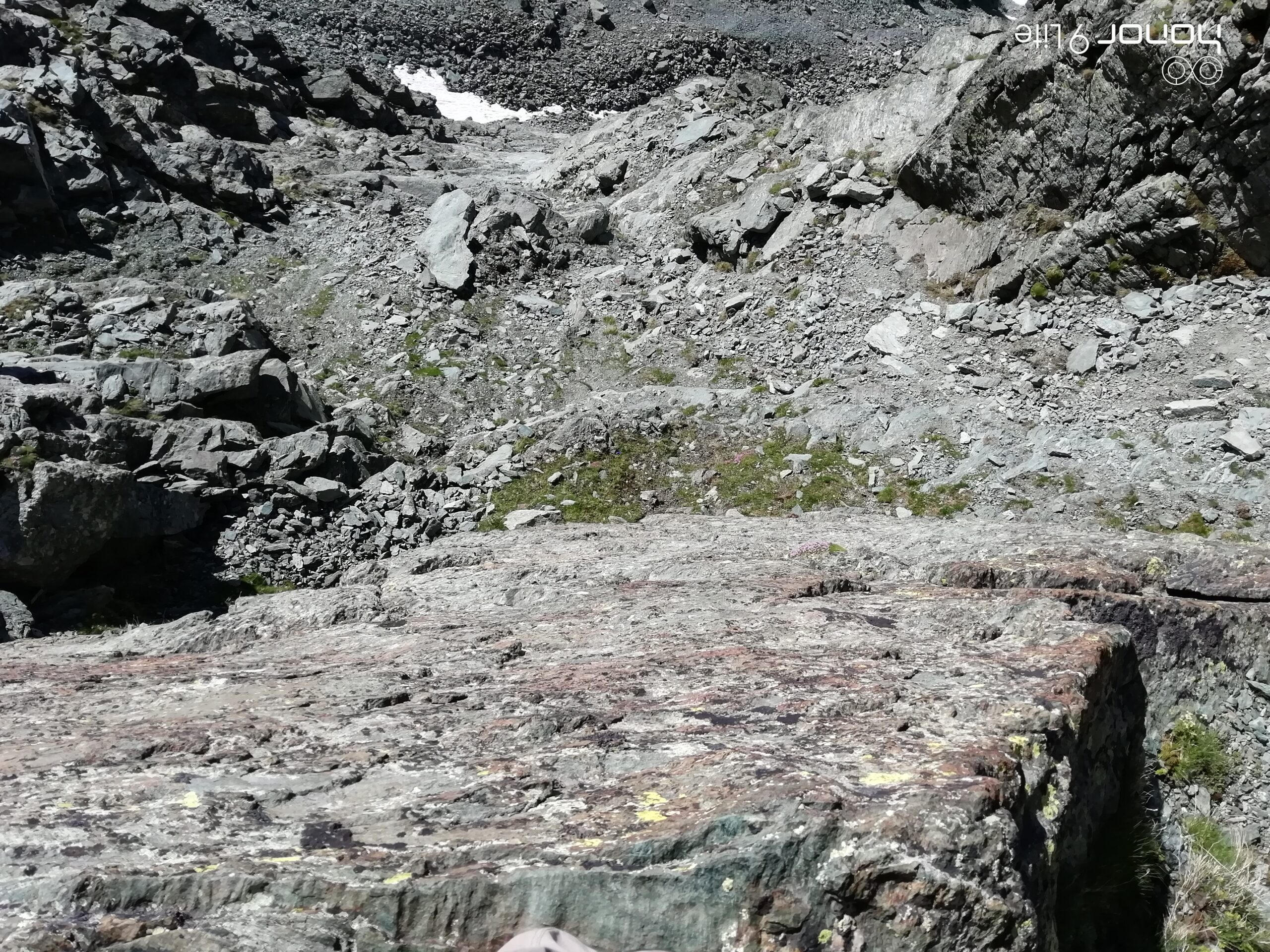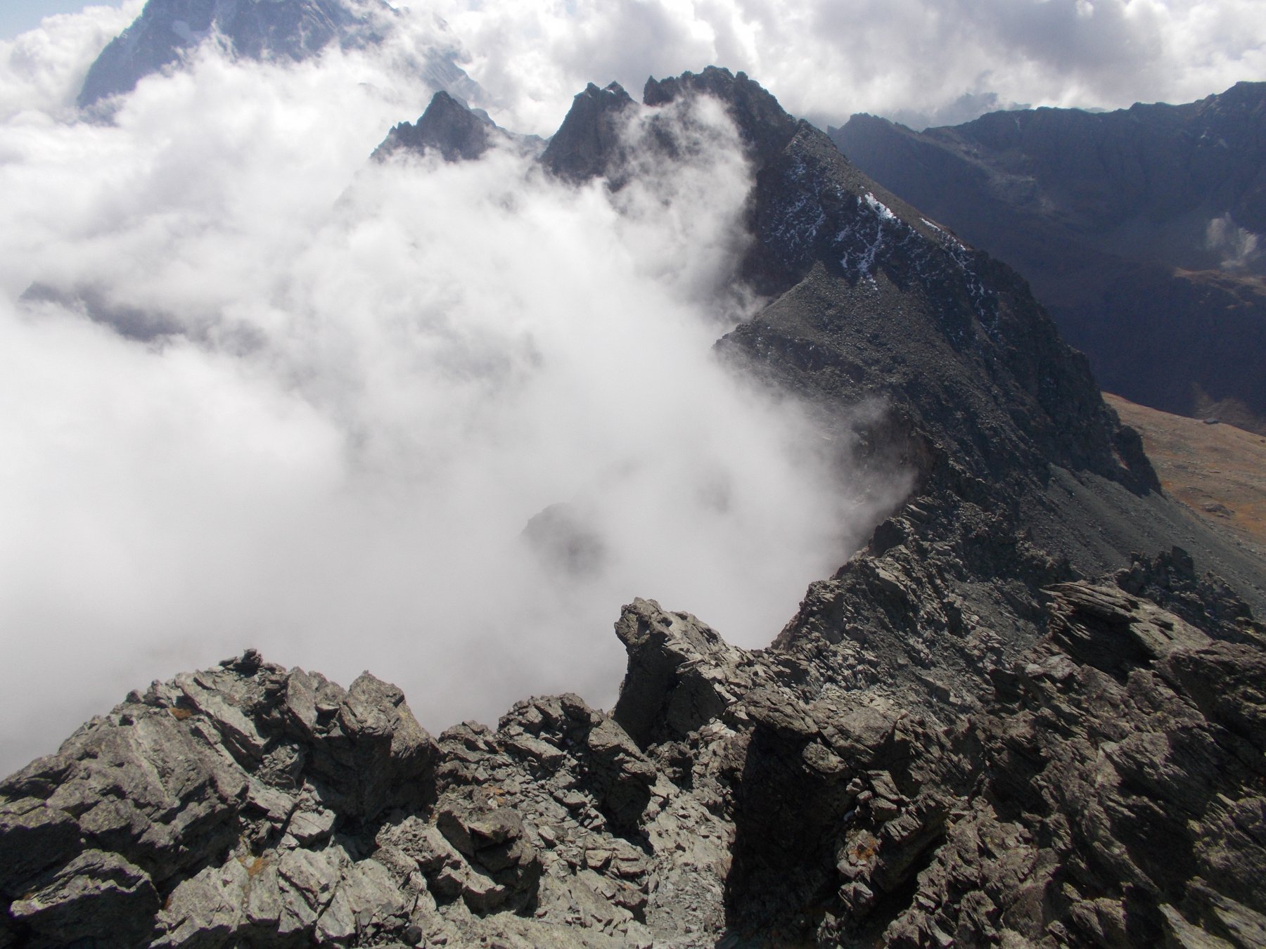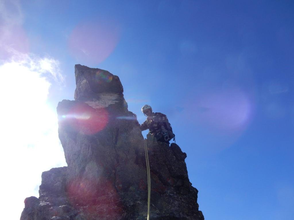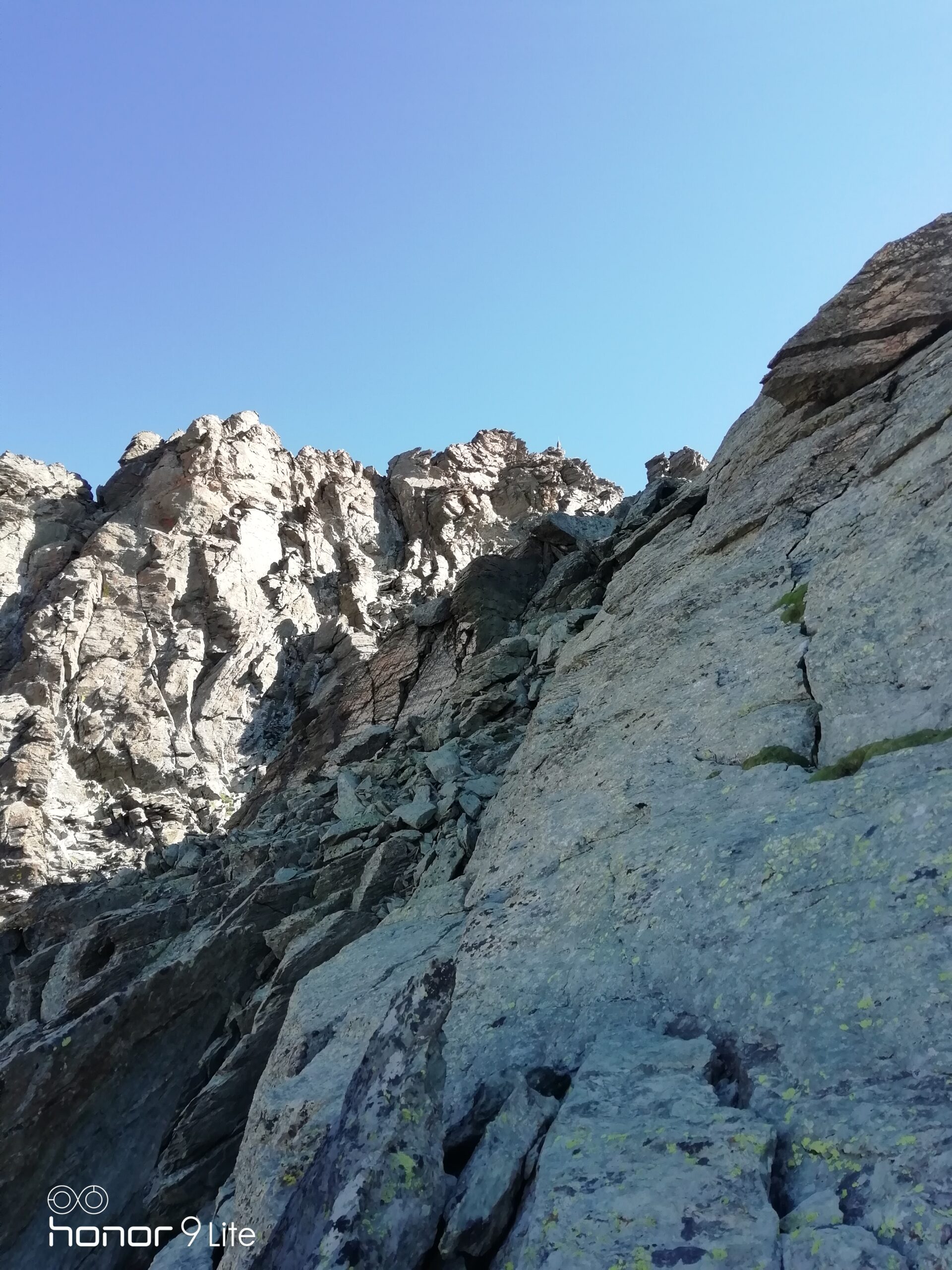 Si attacca ora la cresta, tenendo il filo e seguendo i fix che proteggono i passaggi più duri ed esposti, un muro rivolto verso l’Italia (evitabile passando nel camino a sx, un po’ più facile ma sprotetto) e un gendarme affilato. Da questo si scende in disarrampicata ad una breccia, da dove si rimonta un muro ripido da articolato. Dopo un tratto semipianeggiante, segue un secondo spigolo verticale che si vince sul lato Po (esposto), quindi delle placche appoggiate. Alternando brevi salti ripidi a tratti pianeggianti si arriva ad incrociare la via normale che sale dal col Luisas e attraversa la parete SE (freccia gialla, fixe). Senza imboccare sulla sx il canale dove passa la traccia comune delle vie normali, si prosegue sul filo, superando un ripido muro in una larga fessura. In breve si giunge al torrione finale, dove giunge anche la cresta est. Un ultimo muretto decisamente verticale ed esposto sul lato Po, dove si incontrano gli spit azzurri di una via di Michelin, e si giunge sulla sommità del torrione ed in breve al colletto sotto la Madonna della vetta. Tenendosi ora a sx della linea degli spit azzurri, dopo un muro verticale, per facili blocchi si raggiunge la cima.