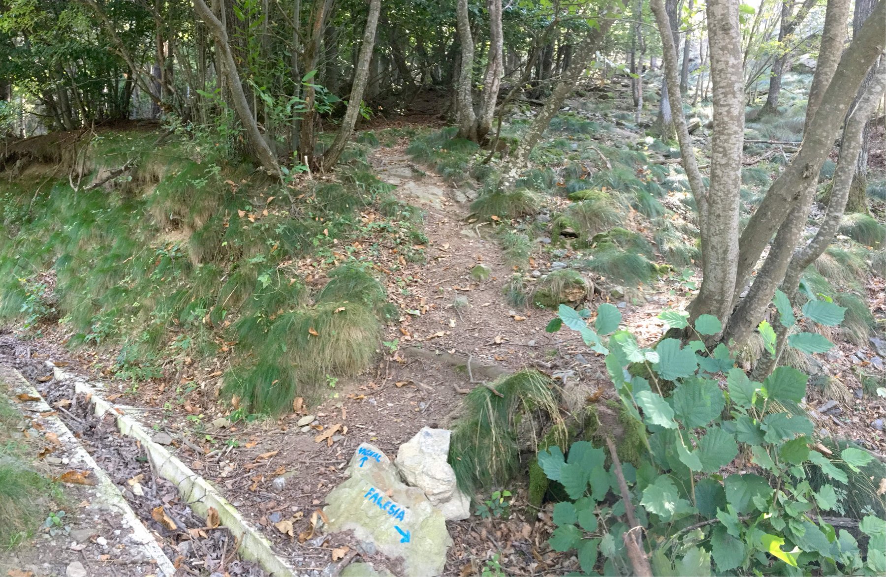Salire 50 metri nel bosco, poi scendere nel canalone fra la Cima delle Grange e il Pilastro di Vignal, raggiunta la bacheca sul pilastro prendere il sentierino sulla dx (bolli blu e ometti) che in breve porta a base via (targhetta).