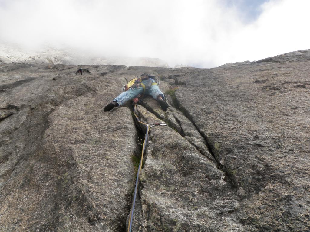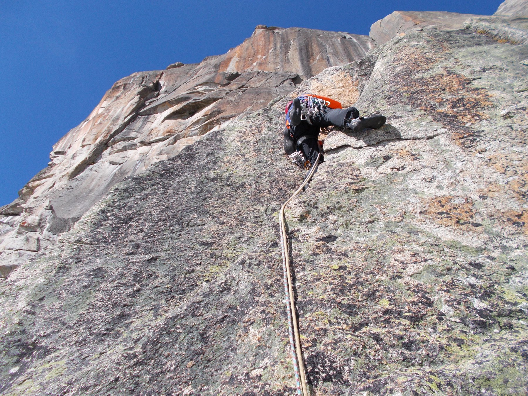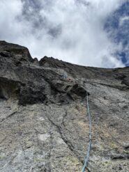 Questo primo tiro è decisamente il chiave, ed il passaggio più difficile è nei primi metri. Lo avevo già percorso molti anni fa salendo Eisbrecher ed anche nel contesto di quella via che è più impegnativa di Accept mi era parso uno dei più difficili. Una cordata che ci seguiva è riuscita ad evitare lo strapiombo iniziale della fessura più facilmente in placca a destra…