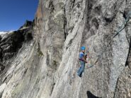 7) Fessura larga obliqua a destra che contorna il naso strapiombante, alla fine ci si infila in un diedro camino abbastanza sgradevole con qualche blocco non proprio rassicurante. 40 m, 3 spit, 5c davvero un po’ stitico… ma io detesto i camini.