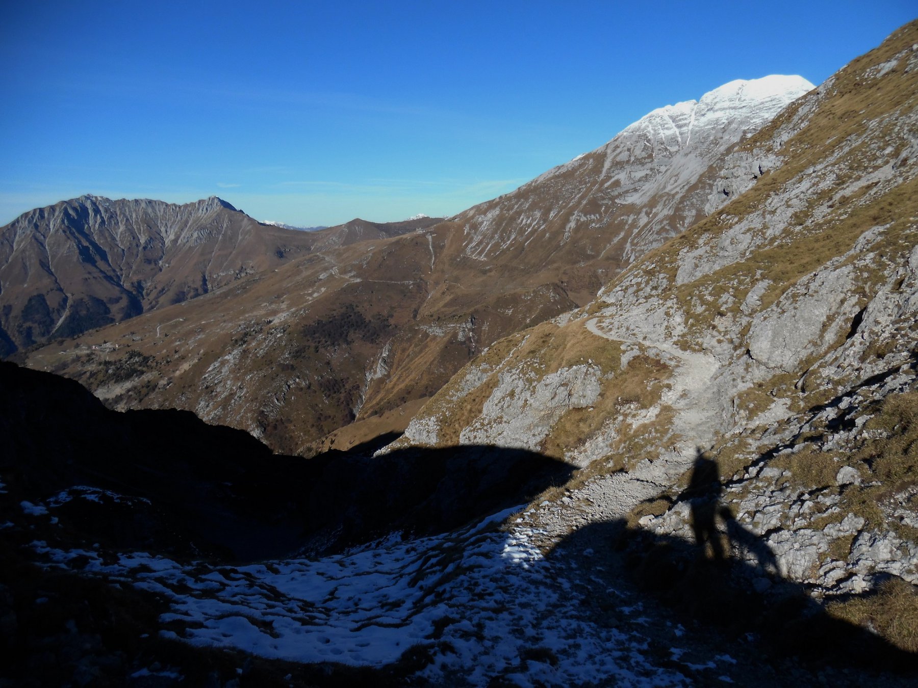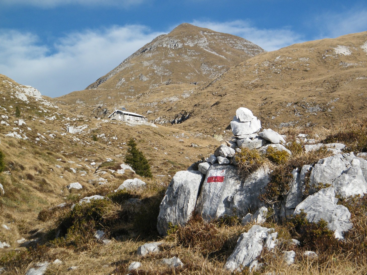 Superato uno stretto passaggio roccioso inizia un traverso verso destra (Est) che porta sulla dorsale erbosa dalla quale, in breve, si raggiunge la Baita di Mezzo, m. 1457.