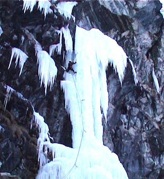 2° tiro 20 mt “la candela” 90°/ 95°, risalire la candela leggermente sulla sinistra, su ghiaccio fragile e petali per i piedi, sosta su cordino ROSSO appena sopra la candela (leggermente a DX)
