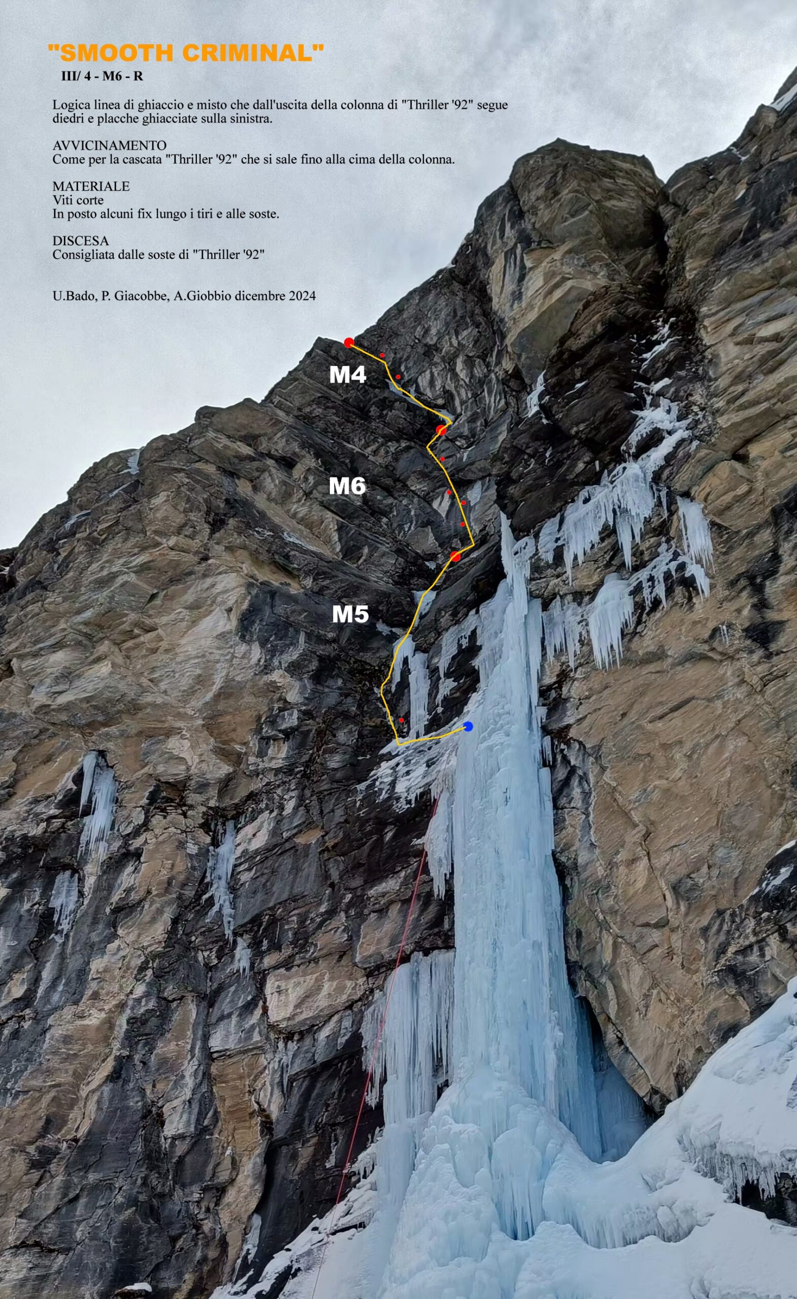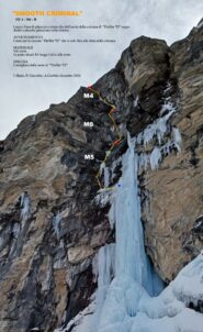 Via di misto di tre lunghezze che segue diedri e placche ghiacciate a sinistra dei due tiri finali di Thriller '92.