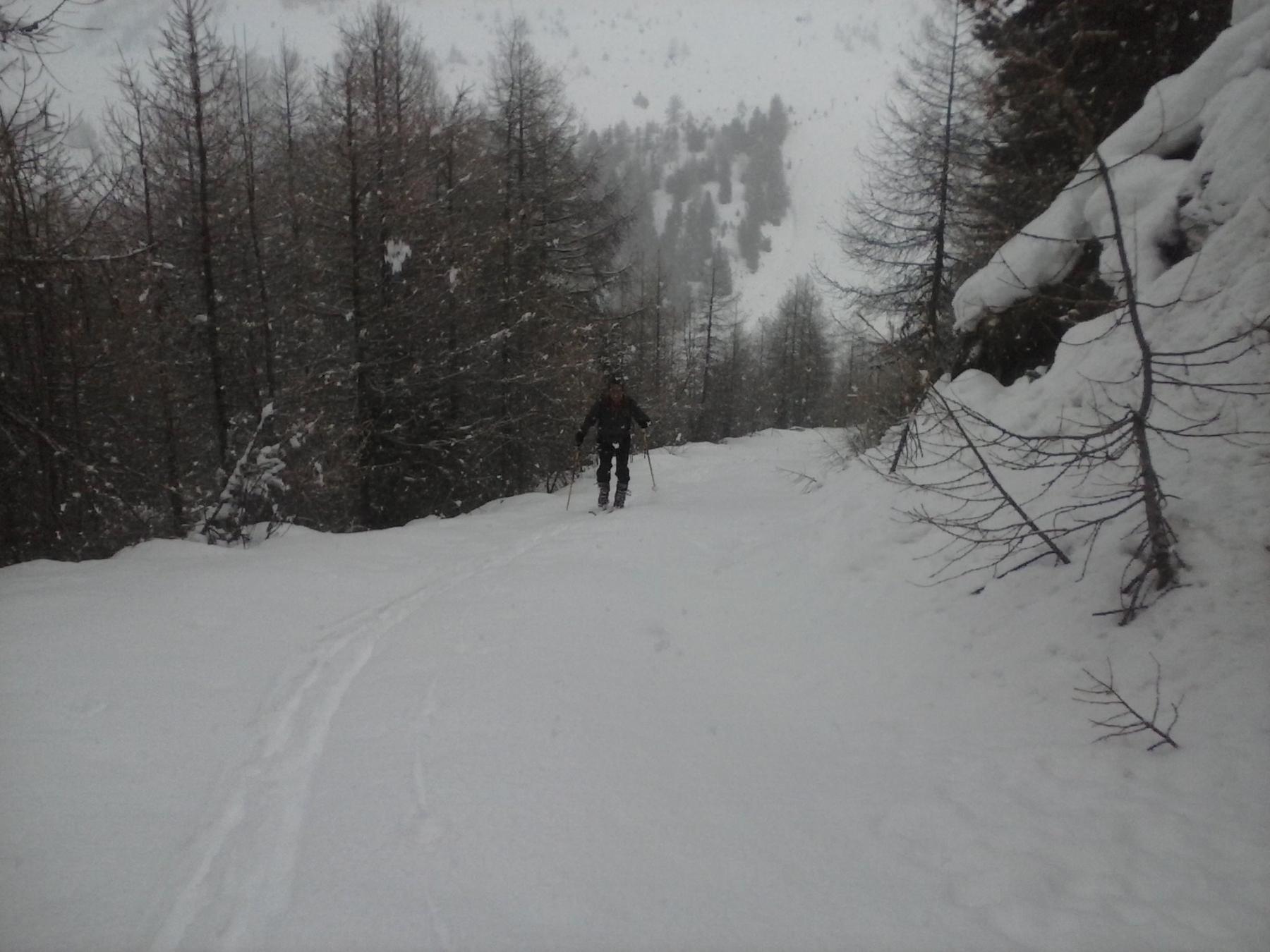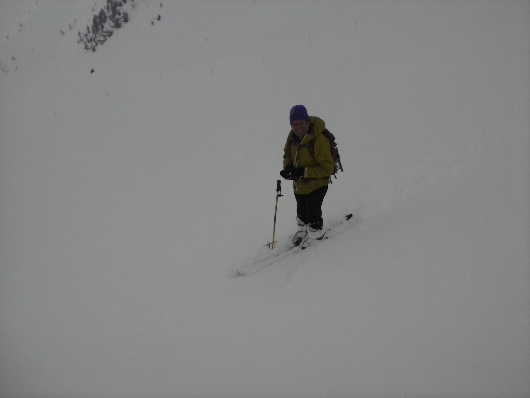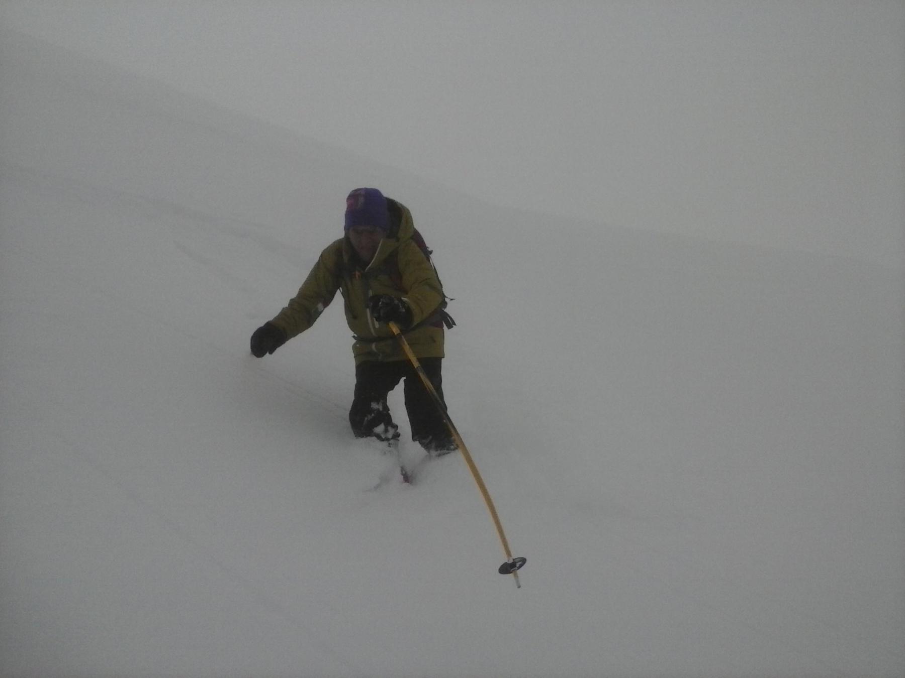Discesa complicata non dalla neve che era da 5 stelle ma dai banchi di nebbia persistenti con visibilità zero…abbiamo sfruttato le poche schiarite e le tracce esistenti che ci hanno permesso di scendere quasi alla cieca ,unica soddisfazione la neve ideale fino al rientro nelle piste ed anche dopo si sciava decentemente fino al parcheggio.