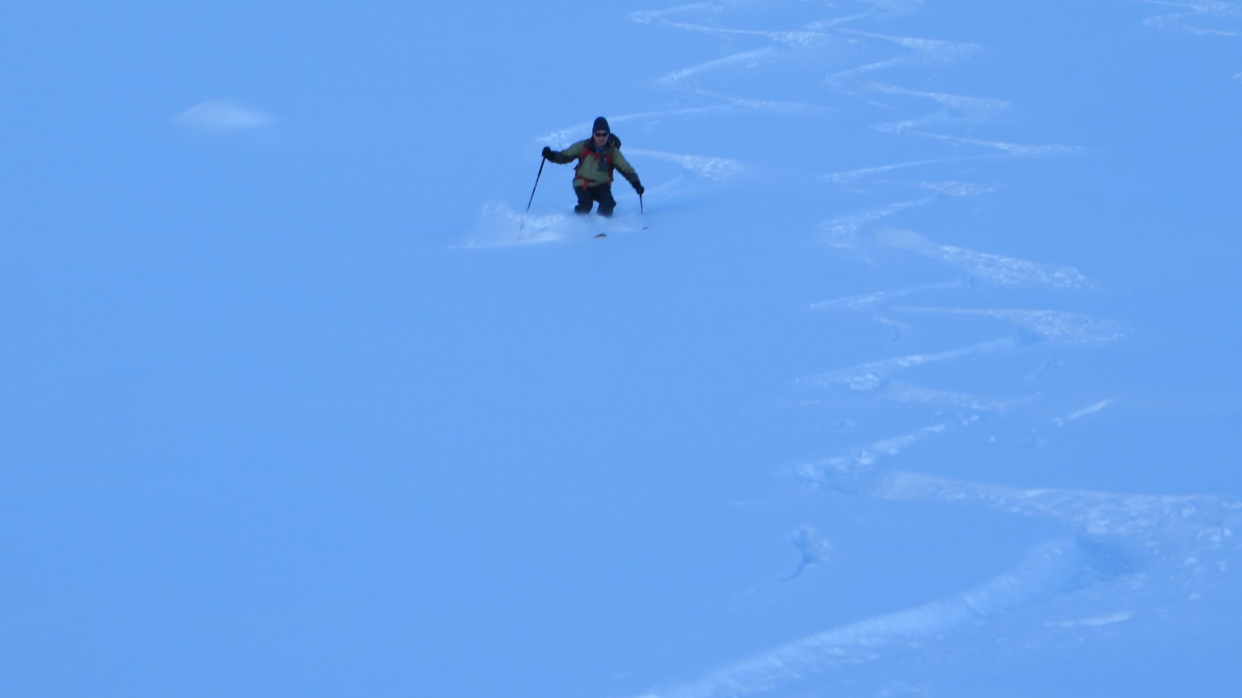 E’ un po’ tradizione godere della splendida conca di Pila prima che venga invasa dai pistaioli. Neve dall’auto, cannoni di neve a tutta forza, si sale tranquilli. Discesa dalla cima tutto a destra, stupenda. Mezzo metro e passa di neve fredda e leggera, pochissime tracce che hanno lasciato praterie immacolate.Così per 400mt fino a incrociare le piste, un po’ dure per la neve artificiale sparata e il passaggio del gatto senza fresatura. Ultimi metri prima dell’arrivo invece fresatura perfetta. Con Enri.,