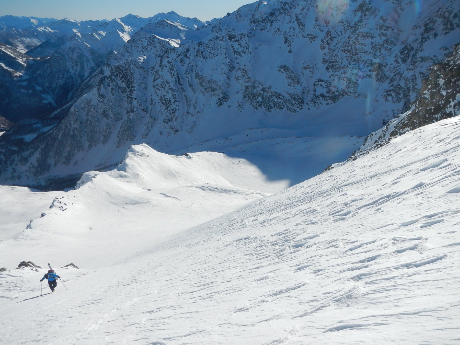 Per la ripidezza di alcuni pendi (sino a 35°) richiede neve assestata.