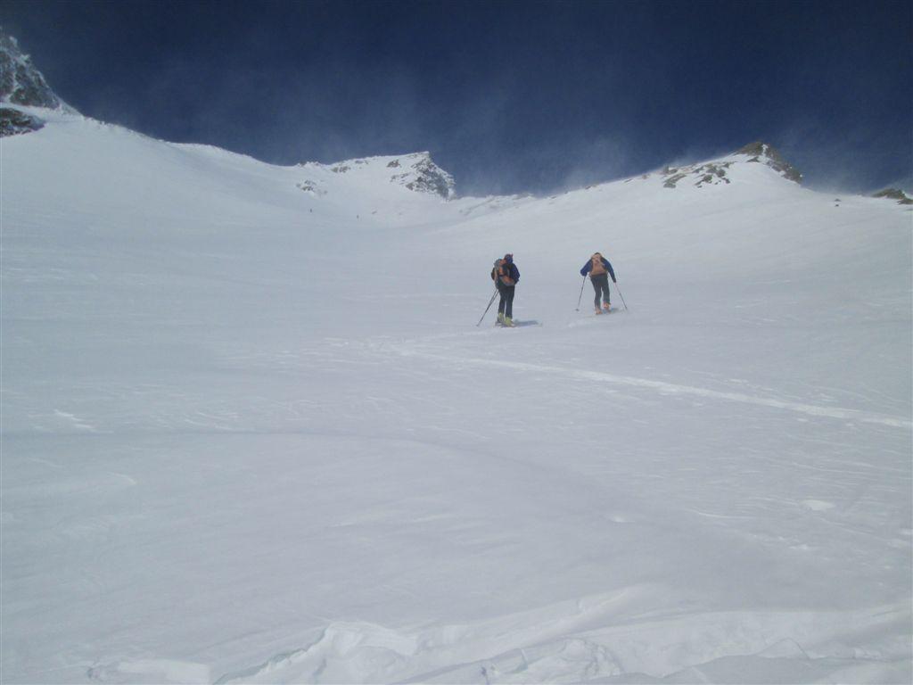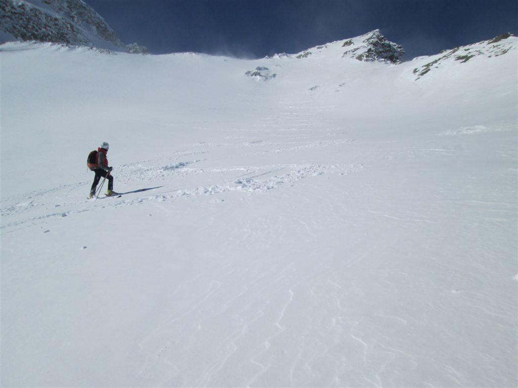 Giornata bella ma con vento costante, fastidioso e con forti raffiche. Buona traccia di salita che però si copriva subito a causa della neve spostata dal vento. Neve abbastanza assestata ma non ancora del tutto trasformata. Fermati all’inizio della cresta per accumuli e vento sempre più forte.