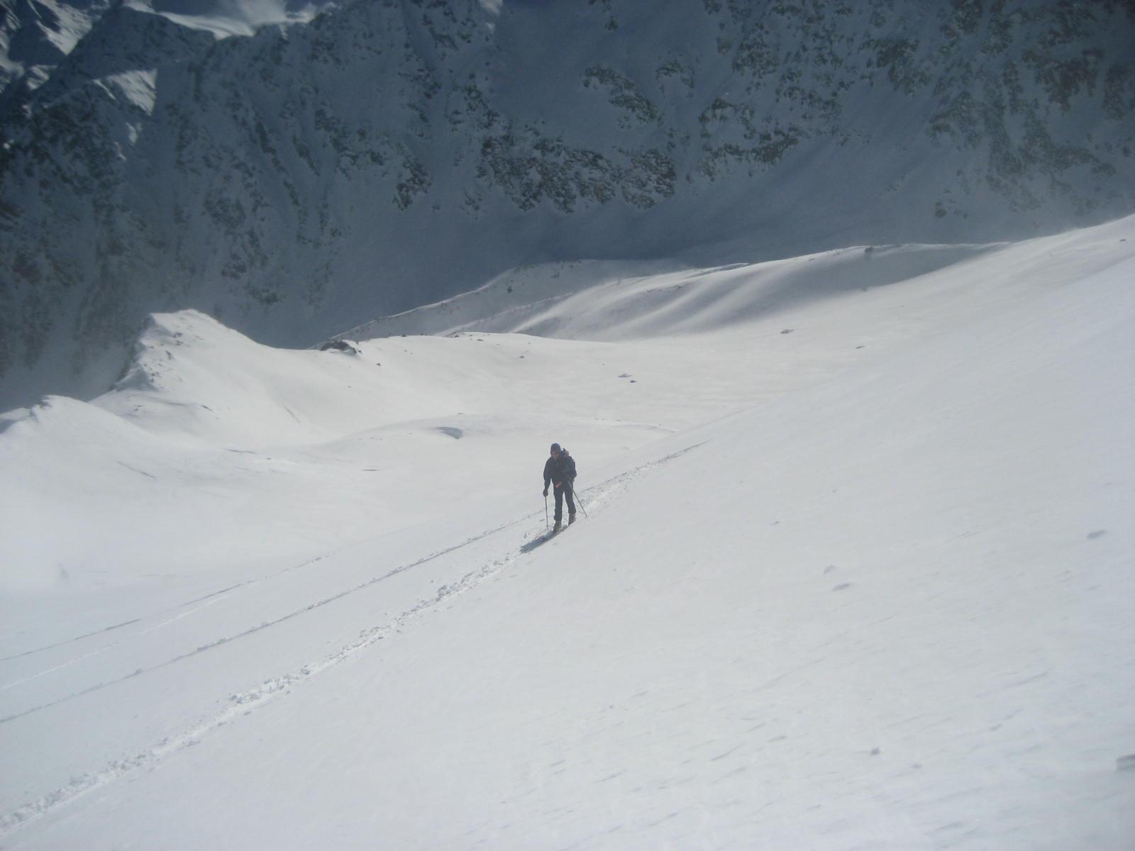 Aggiungo qualche scatto e “ricopio” il commento di Roberto (robyberg), preciso, puntuale e completo (come sempre), con il quale -insieme a Davide B.- ho condiviso questa gita. Eravamo partiti con in mente un’altra destinazione vicina, ma il vento e la sua immagine e ombra mattutina ci hanno portati su quest’itinerario, sicuramente interessante con una migliore consistenza di neve. Quella attuale -crostosa-richiede una sciata lieve, soffice…(se si vuole stare sopra la crosta), oppure super aggressiva se invece gli sci sono sotto la crosta… Gli ampi spazi permettono tuttavia di “arrangiarsi”… Tratto finale ripido, e quindi è utile/indispensabile avere i coltelli e anche i ramponi per la parte a piedi oggi non percorsa.
