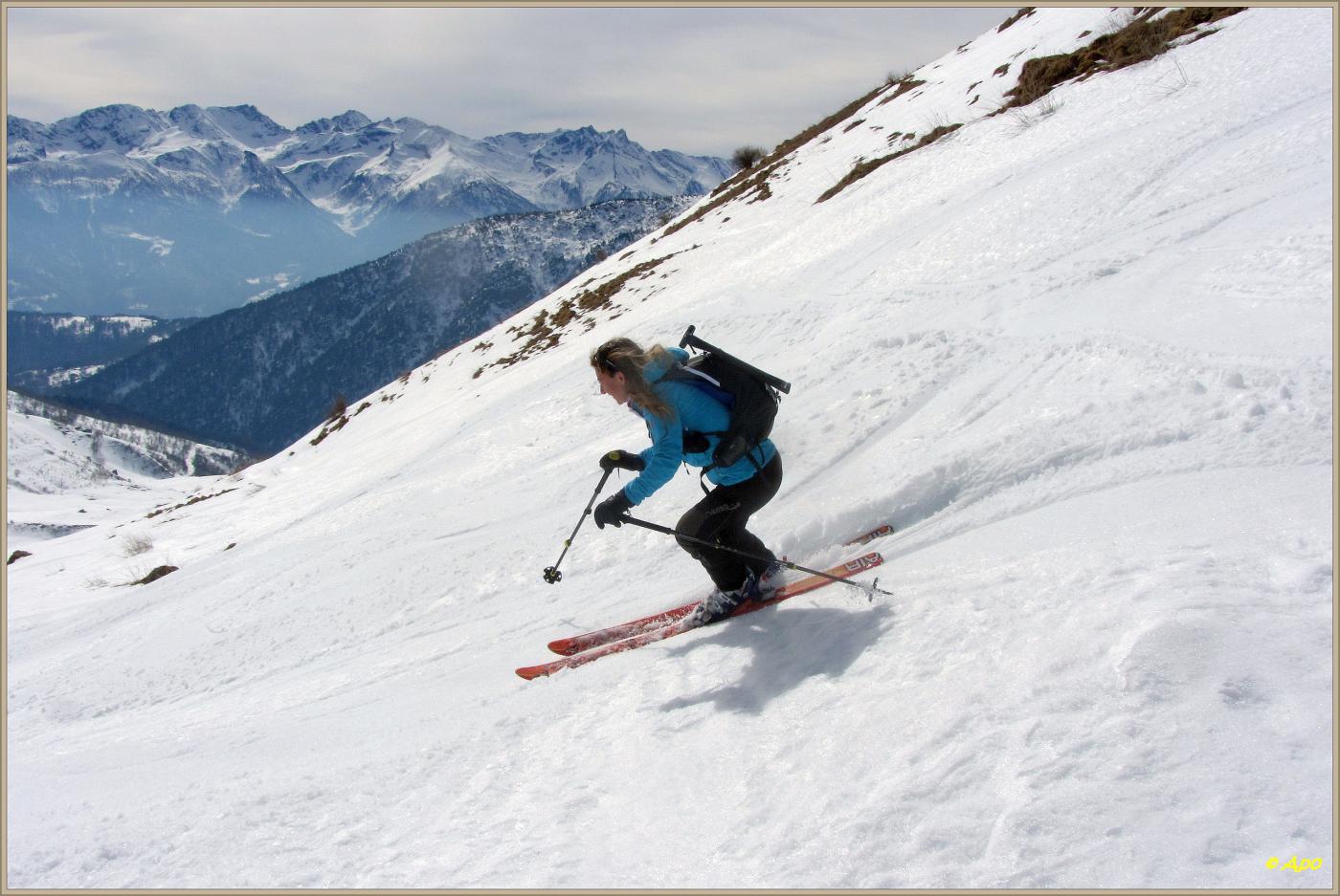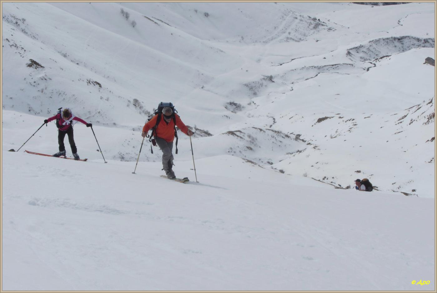 Sicuramente una “gita-millino” decisamente significativa ed appagante. Non poco lo spostamento prima di iniziare la vera salita, che al momento si intraprende praticamente alla stessa quota di dove si sono lasciate le auto (!), cioè una cinquantina di metri sopra alla cascata fuori dal bosco sugli ampi pendii. Calcolate almeno un’oretta di buta e gava sia per l’andata che per il ritorno, al momento più con portage che scivolando. In alto utili i coltelli se si parte molto presto (abbiamo visto due persone scendere alle 11.00). Siamo saliti e scesi per ultimi e…la fortuna ci ha assistito perchè nel ridiscendere abbiamo potuto godere di una splendida apertura del cielo e della luce! Firn stupendo.