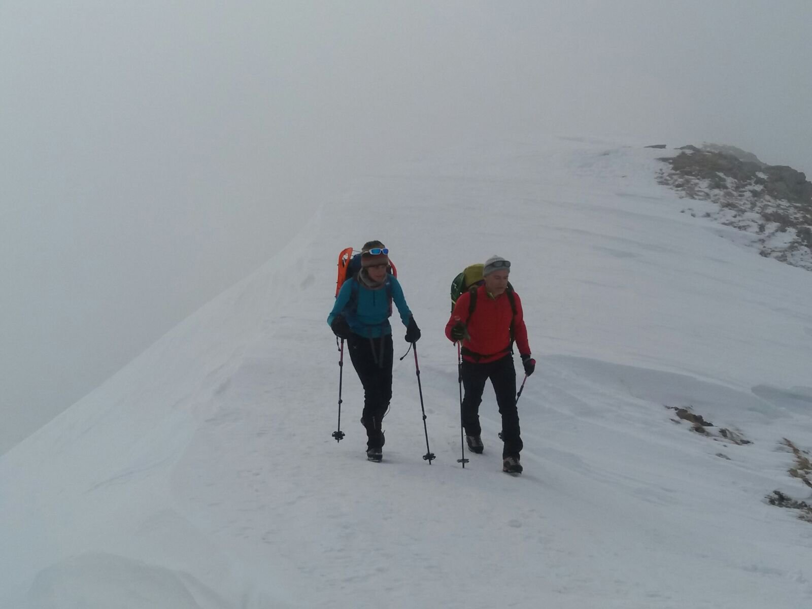 Saliti allo Sbaron con qualche raggio di sole, da qui in poi con neve dura portante fino al Grifone, in vetta con nebbia e gelo… scesi Verso alpe Portia percorso lungo anello fino all’auto