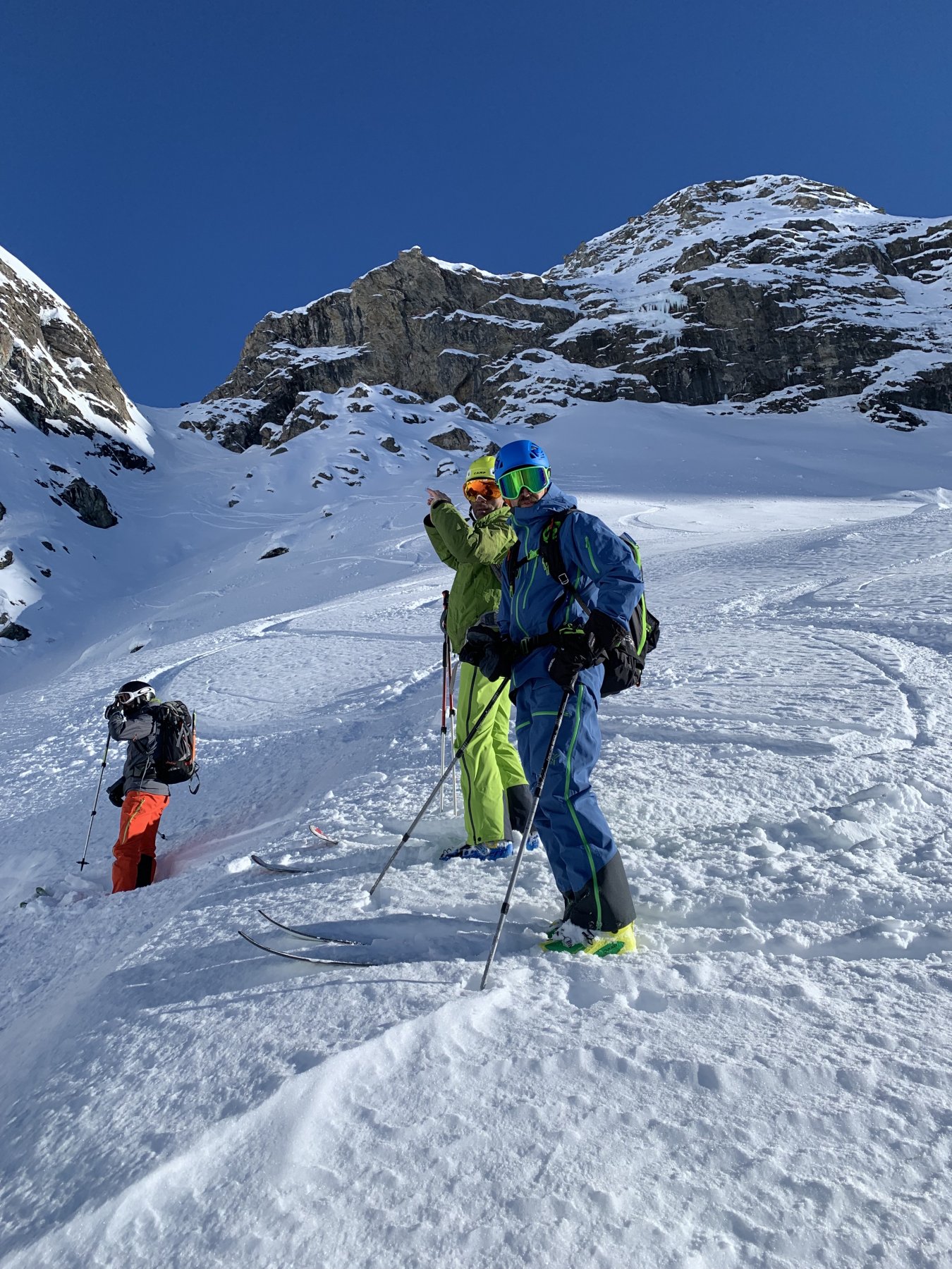 Saliti al crest con la nuova telecabina (€ 10 a/r); nel vallone che porta al canale la situazione neve migliora rapidamente, le tracce vanno tutte verso la Gran Cima, verso testa Grigia si batte. Il pendio sotto il canale è bellissimo ma molto carico. Canale (di dx) salito sci ai piedi in bella farina compressa, sino agli ultimi 15 metri di crosta da vento. Comba superiore, verso il colle, ed anche sopra, in condizioni stupende. Abbiamo seguito, un po a caso, una linea più a est, salendo la bellissima conca sotto il monte Pinter e poi la parete sudovest del medesimo, dove aumentano pendenza ed esposizione (4.1E2?). Ci siamo fermati sotto la cima del Pinter, dove iniziava a padroneggiare una pessima crosta non portante e l’ora si era fatta tarda. Discesa della paretina accorta, resa poco divertente dalla qualità della neve. Dal salto di rocce alla base della parete in giù, invece, tanta roba, farina asciutta più o meno pressata ma sempre ottima, canale e pendio sottostante con neve profonda, da sballo, qualche crosticina in più ma non si sente troppo. Poi boschetto infame e piste.