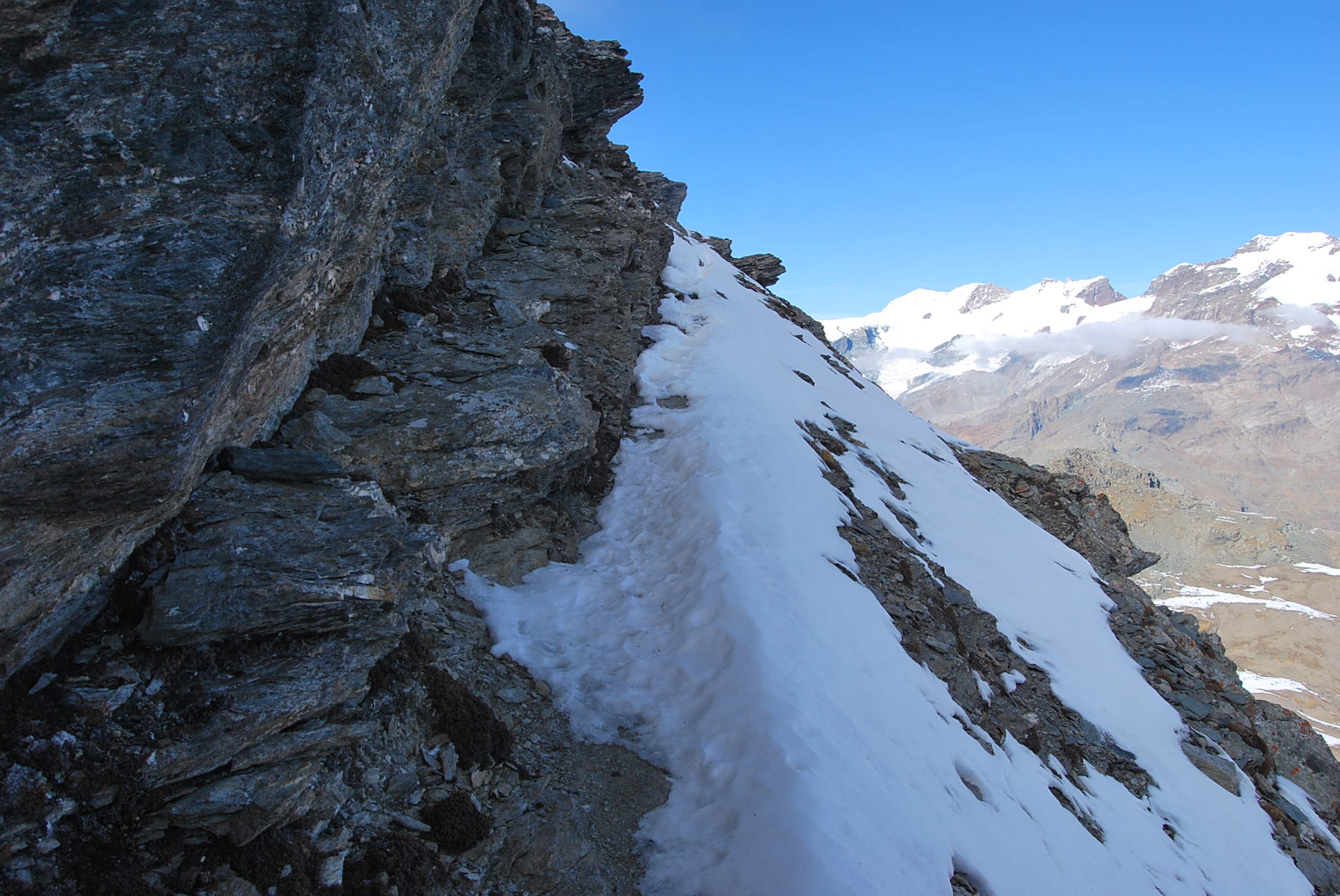 Partito da Tschemenoal (non da Gressoney per evitare 20’ di puro spostamento), salito al Colle Pinter e quindi verso il Bivacco dove si incontra già una sfarinata di neve gelata sul versante meno esposto. Senza toccare il bivacco ho puntato verso la vetta; tutto facile in cresta, la vera difficoltà è dopo il risalto con la catena: il cengione è innevato/verglassato, la salita con la fune d’acciaio è nella neve e un tratto di fune è sommerso. Il tutto non dà un gran senso di sicurezza ma grazie alle impronte presenti il tratto è percorribile.