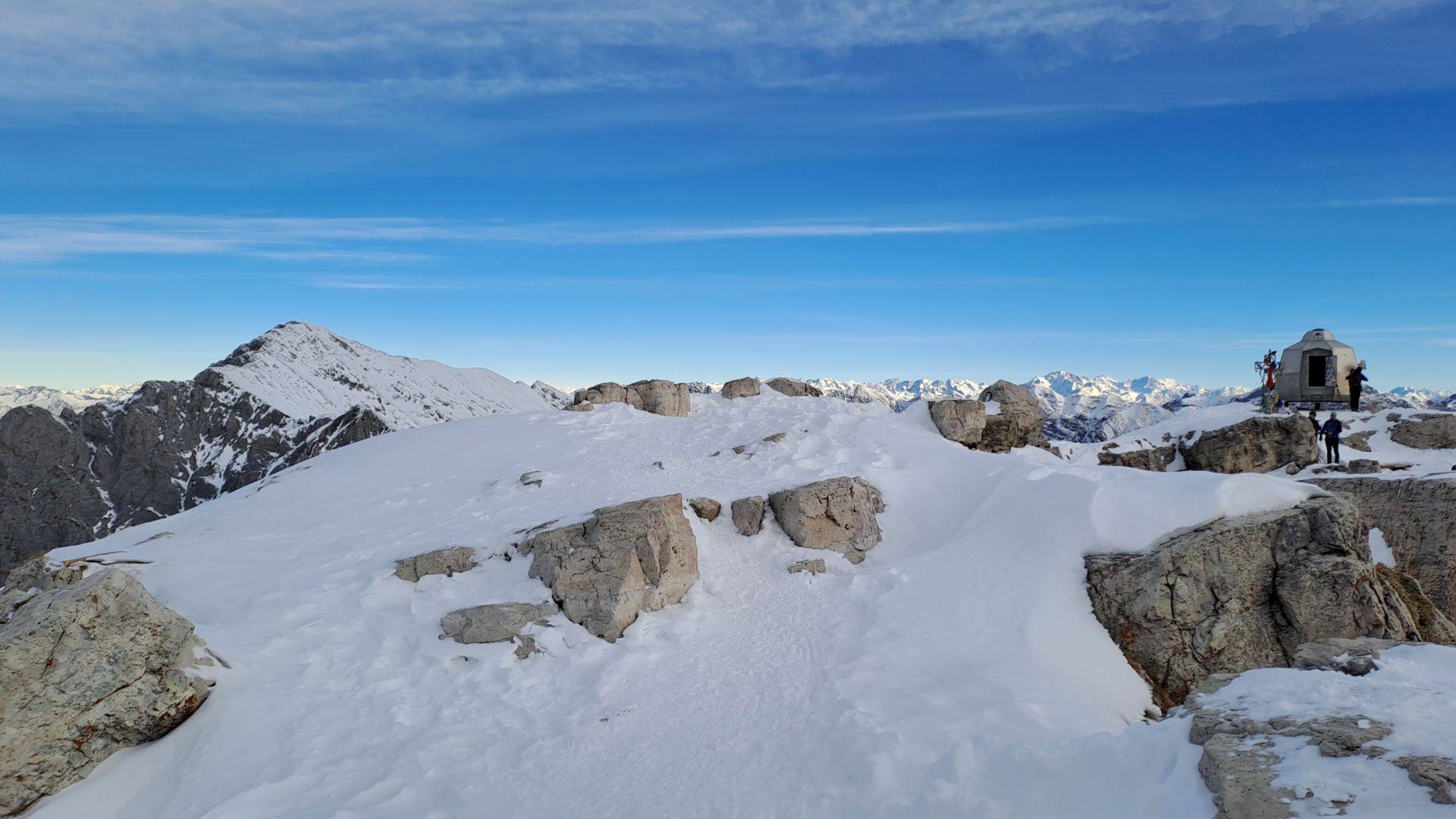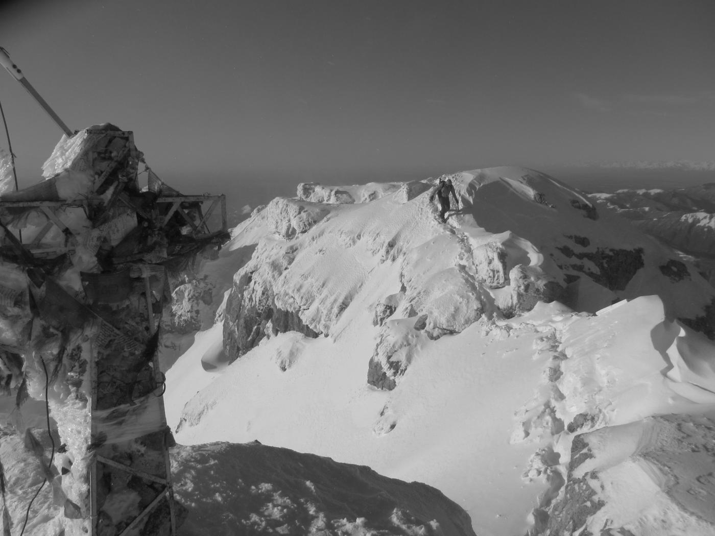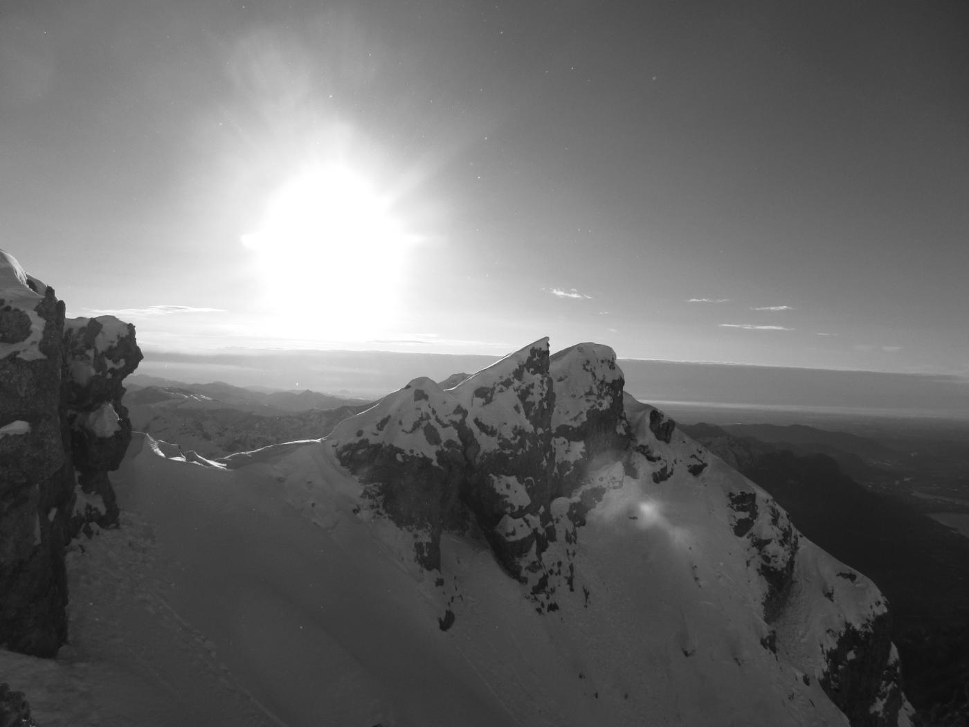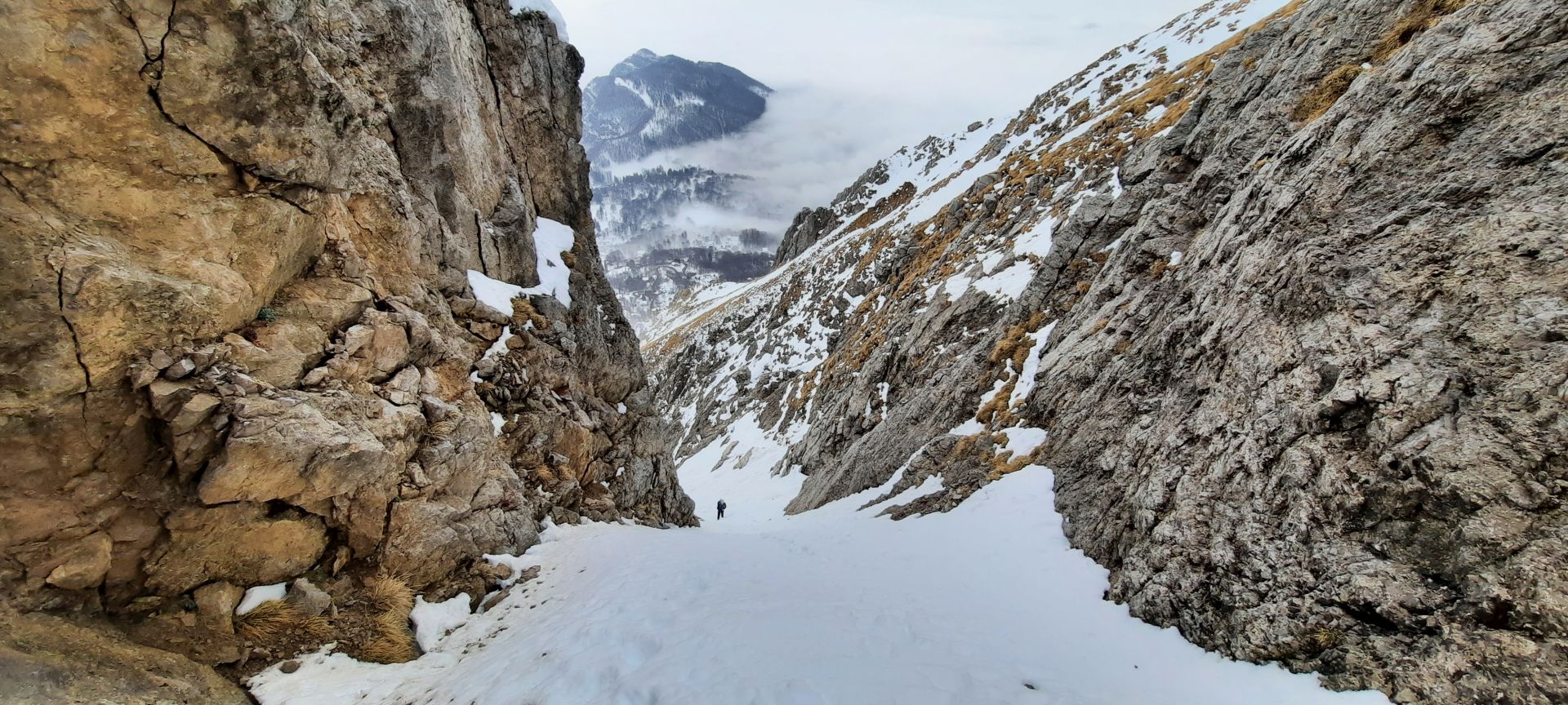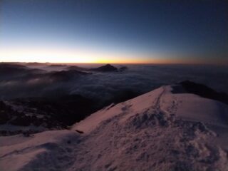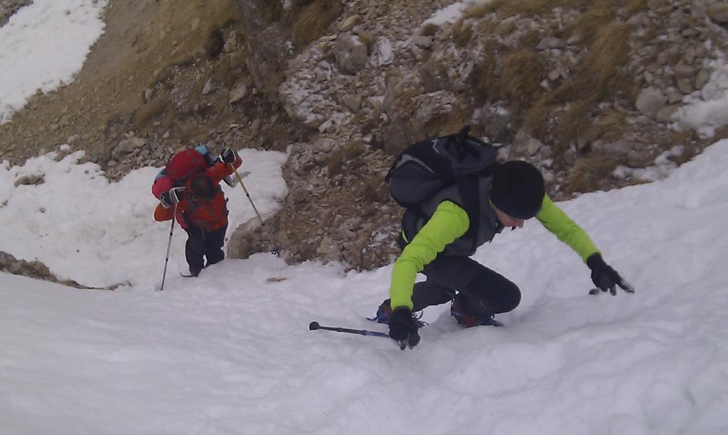 Circa 100 metri sotto la cresta prendere il ramo di destra (uscita classica); è possibile seguire anche il ramo di sx più lungo ma più ripido che esce sempre sulla cresta cermenati ma più a monte.