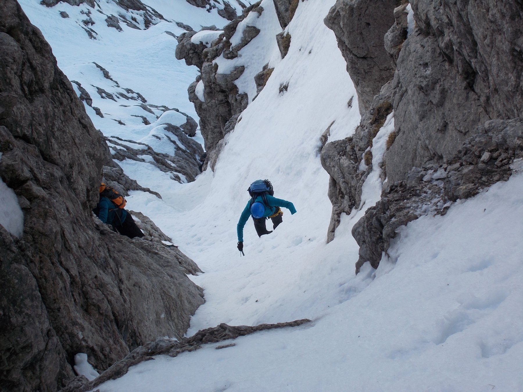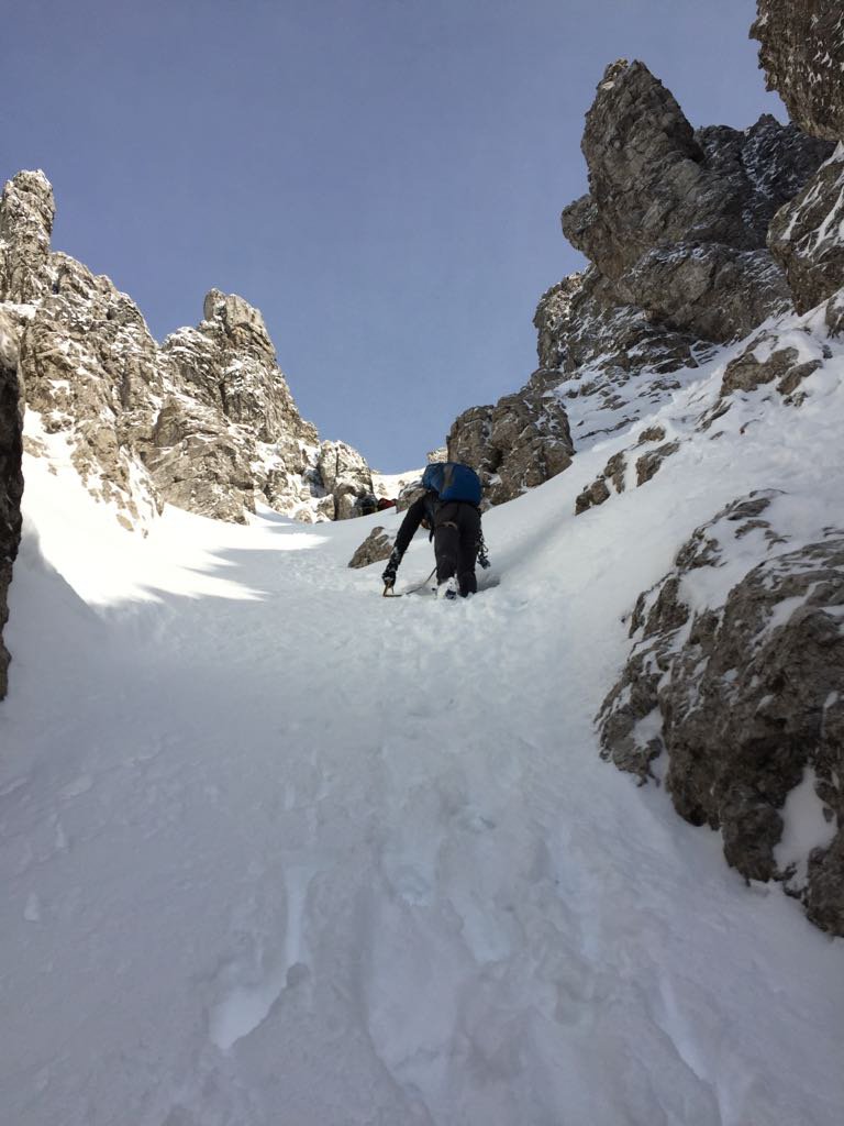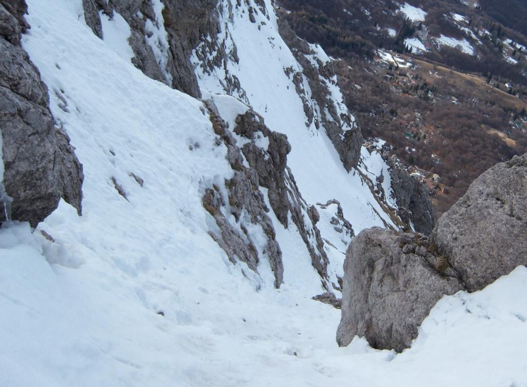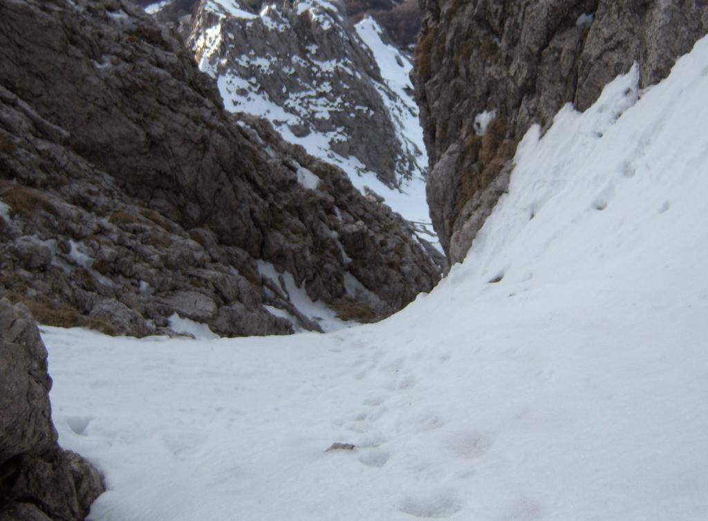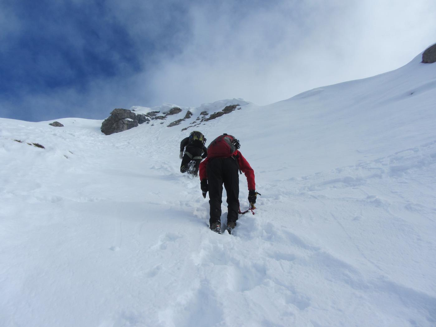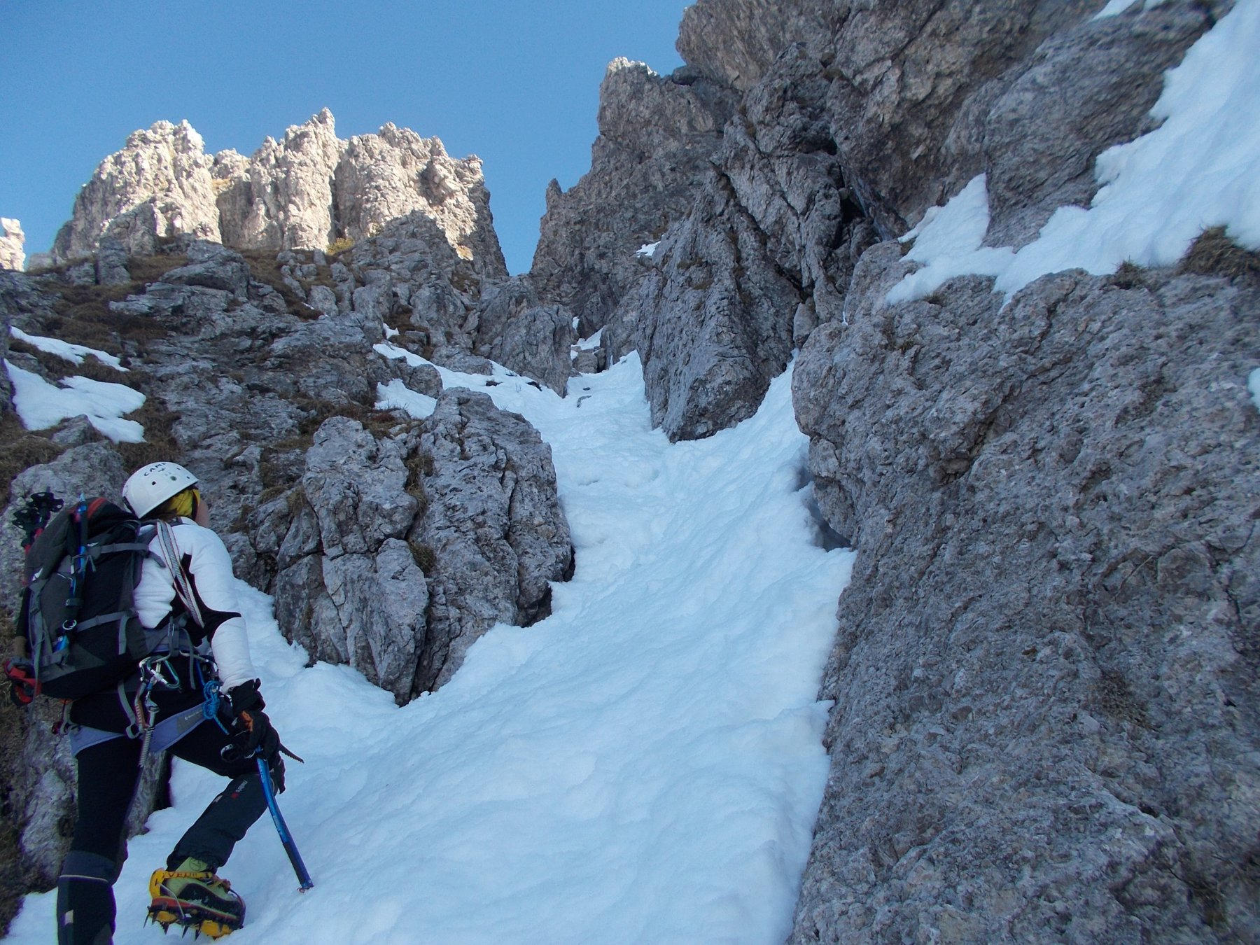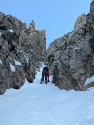 Segue poi un tratto più ampio con pendenza a 40° e che nel punto in cui si restringe arriva fino a 50° (tratto molto bello). Infine si procede per un pendio nevoso fino a sbucare sulle cresta Cermenati nei pressi dell’uscita del sentiero Cecilia.