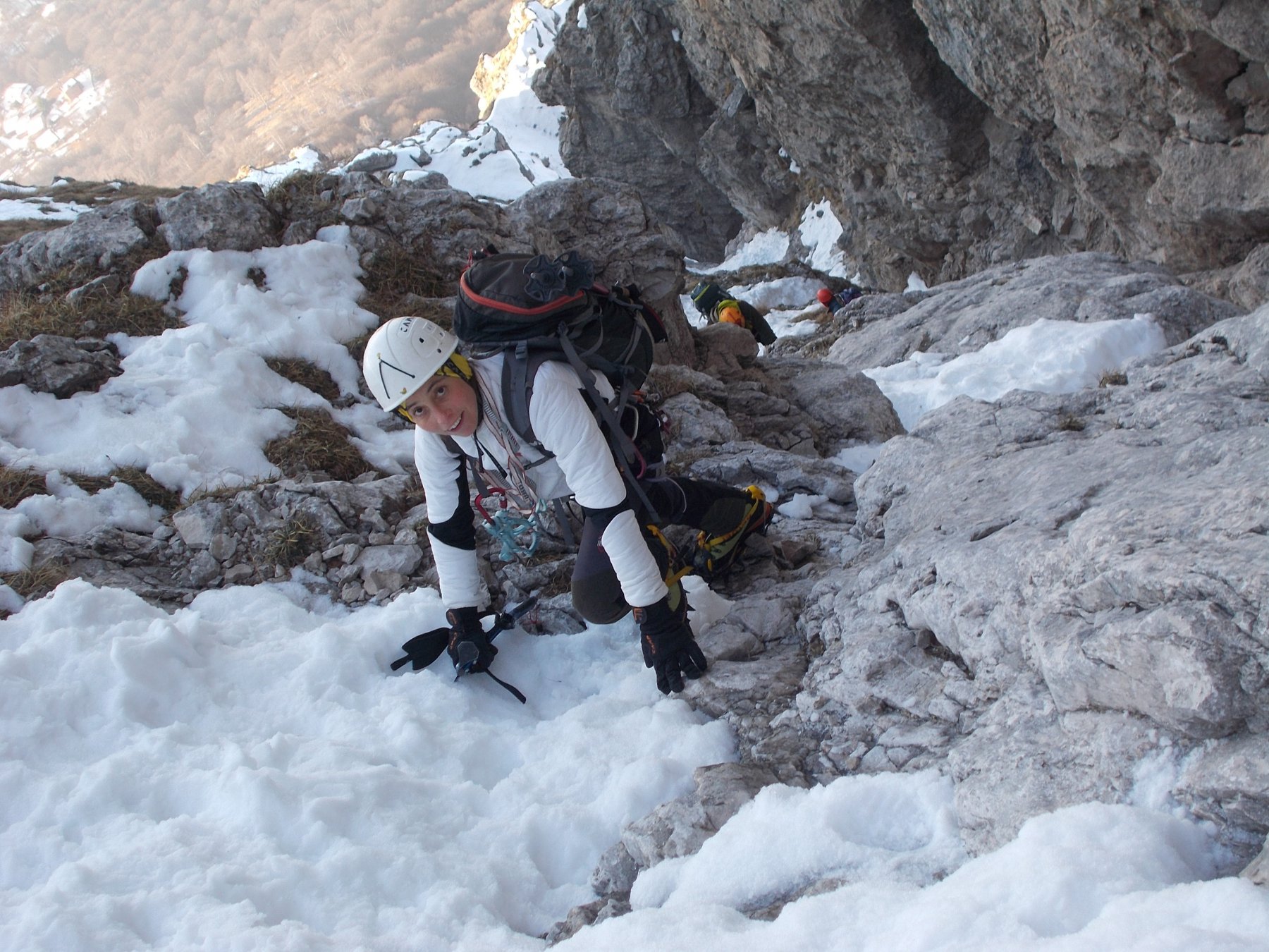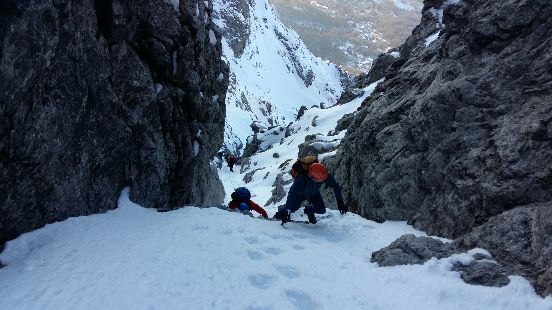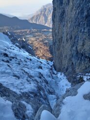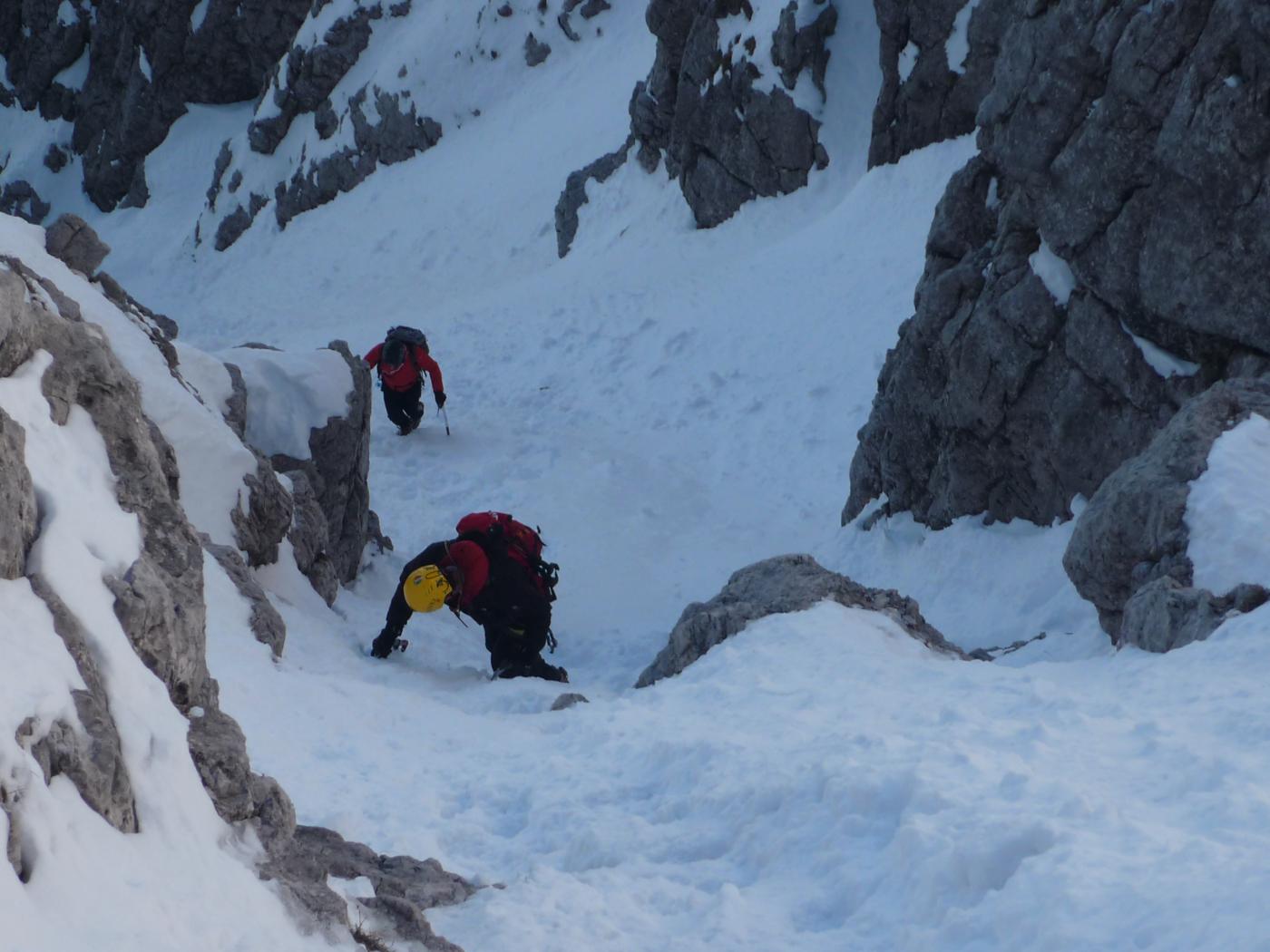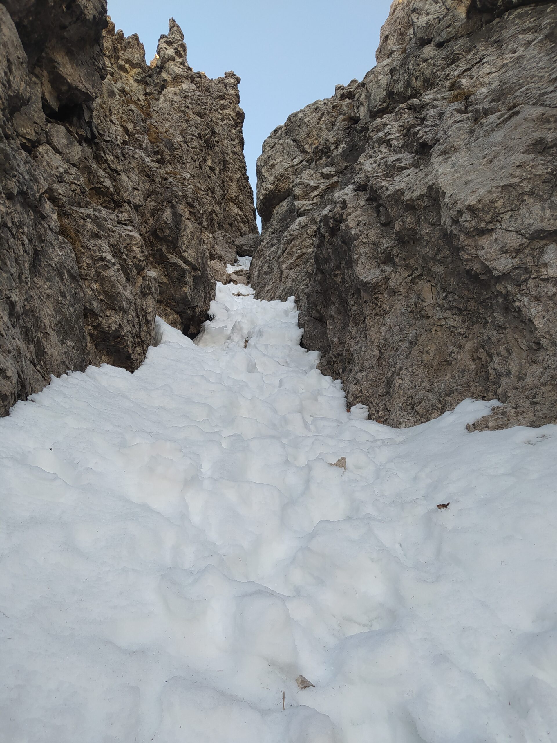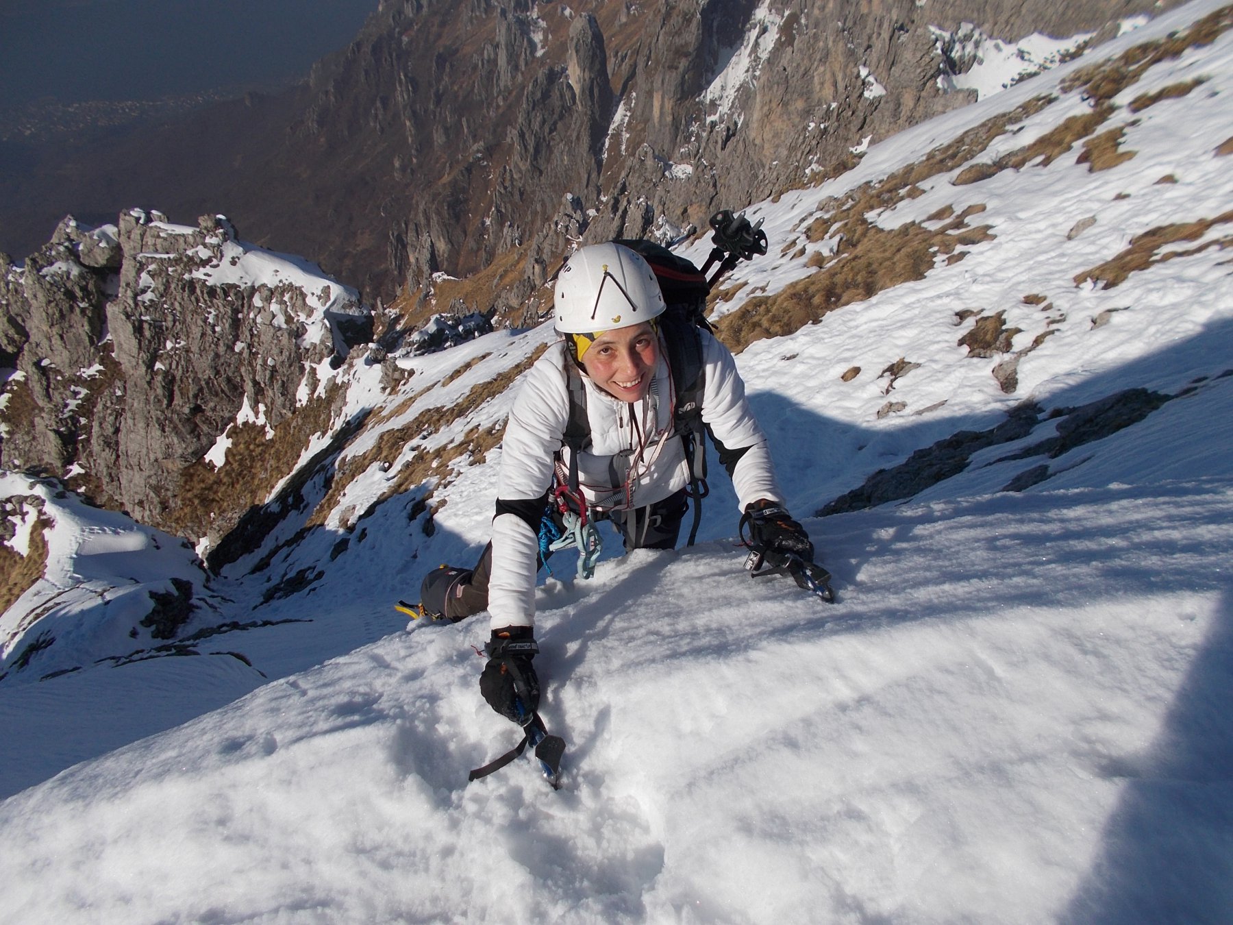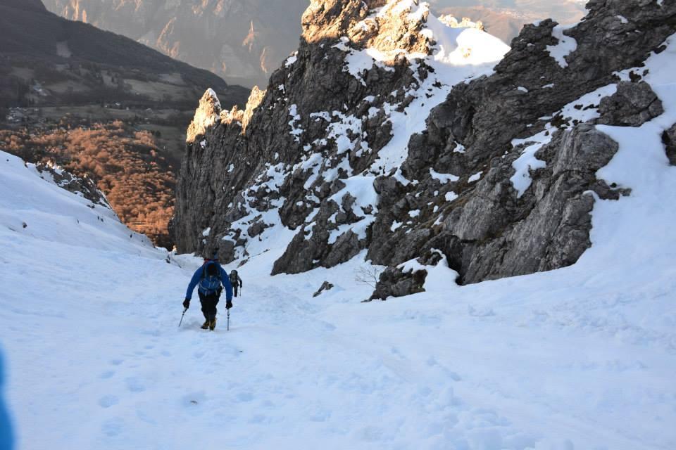 Segue poi un tratto più ampio con pendenza a 40° e che nel punto in cui si restringe arriva fino a 50° (tratto molto bello). Infine si procede per un pendio nevoso fino a sbucare sulle cresta Cermenati nei pressi dell’uscita del sentiero Cecilia.