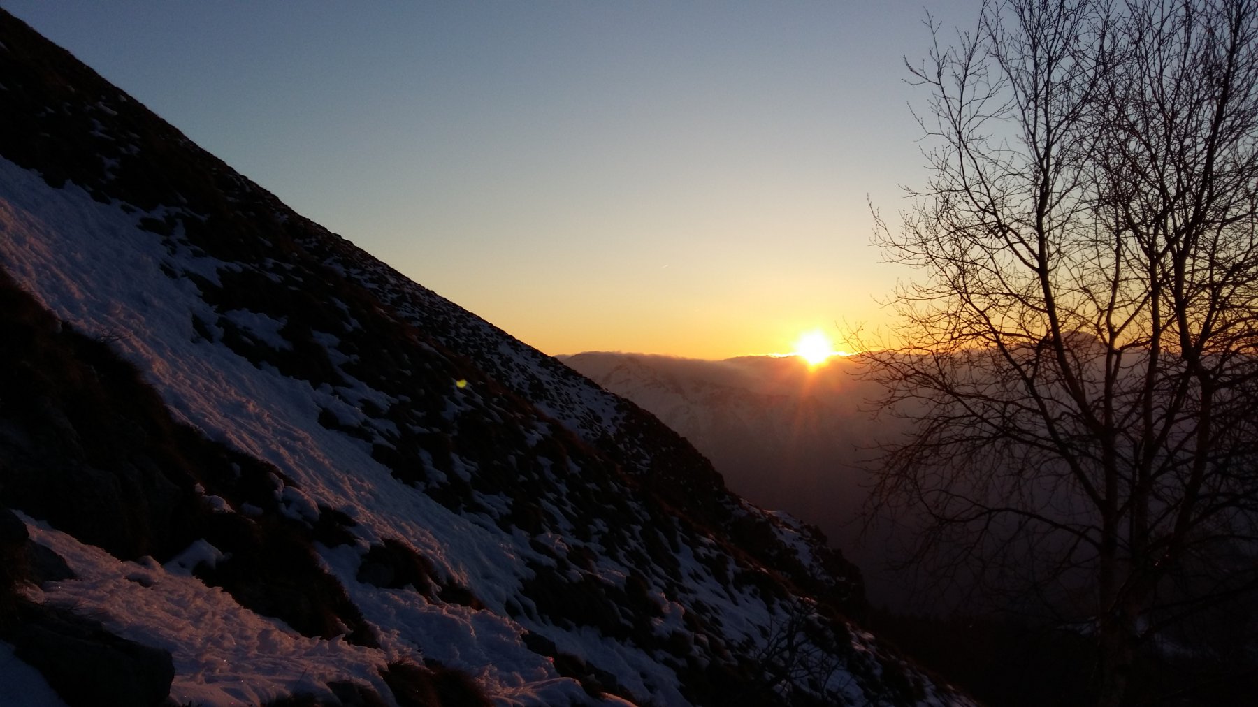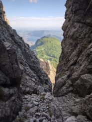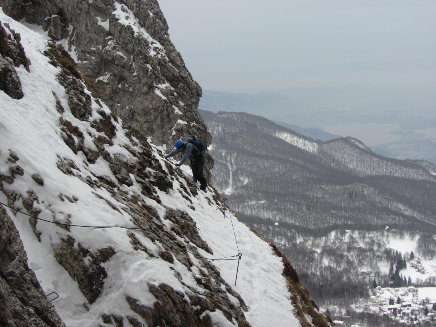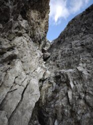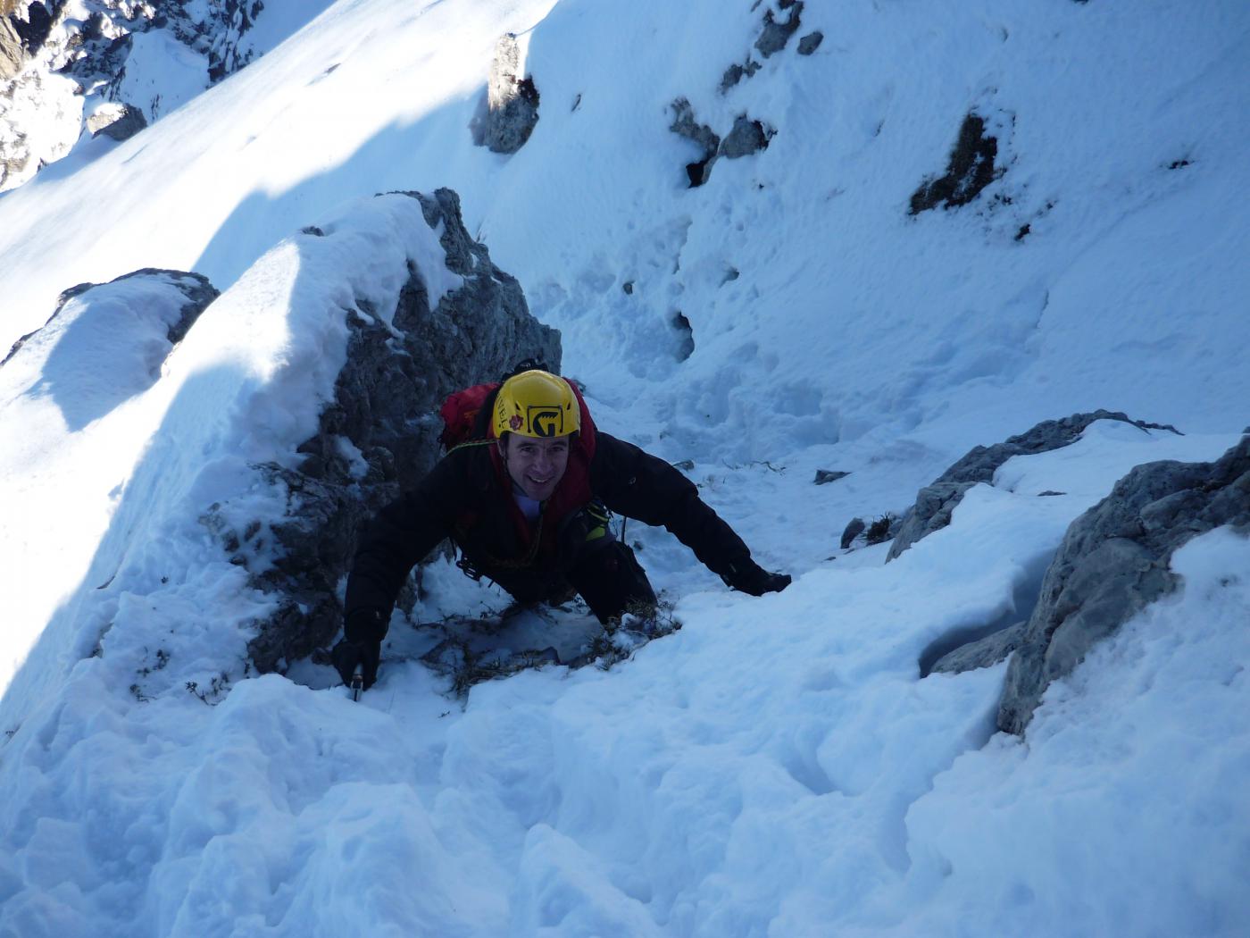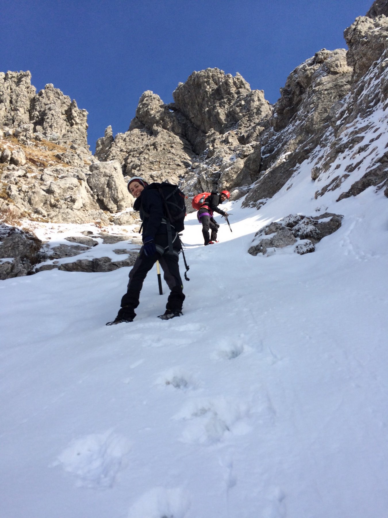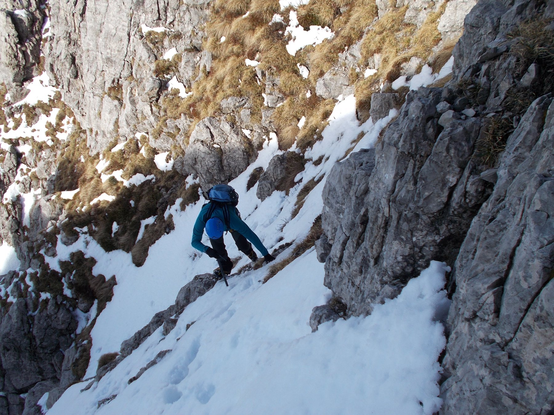 Segue poi un tratto più ampio con pendenza a 40° e che nel punto in cui si restringe arriva fino a 50° (tratto molto bello). Infine si procede per un pendio nevoso fino a sbucare sulle cresta Cermenati nei pressi dell’uscita del sentiero Cecilia.