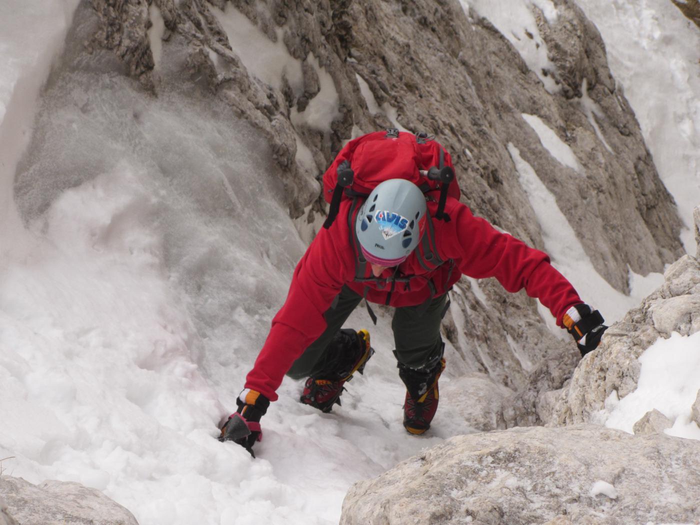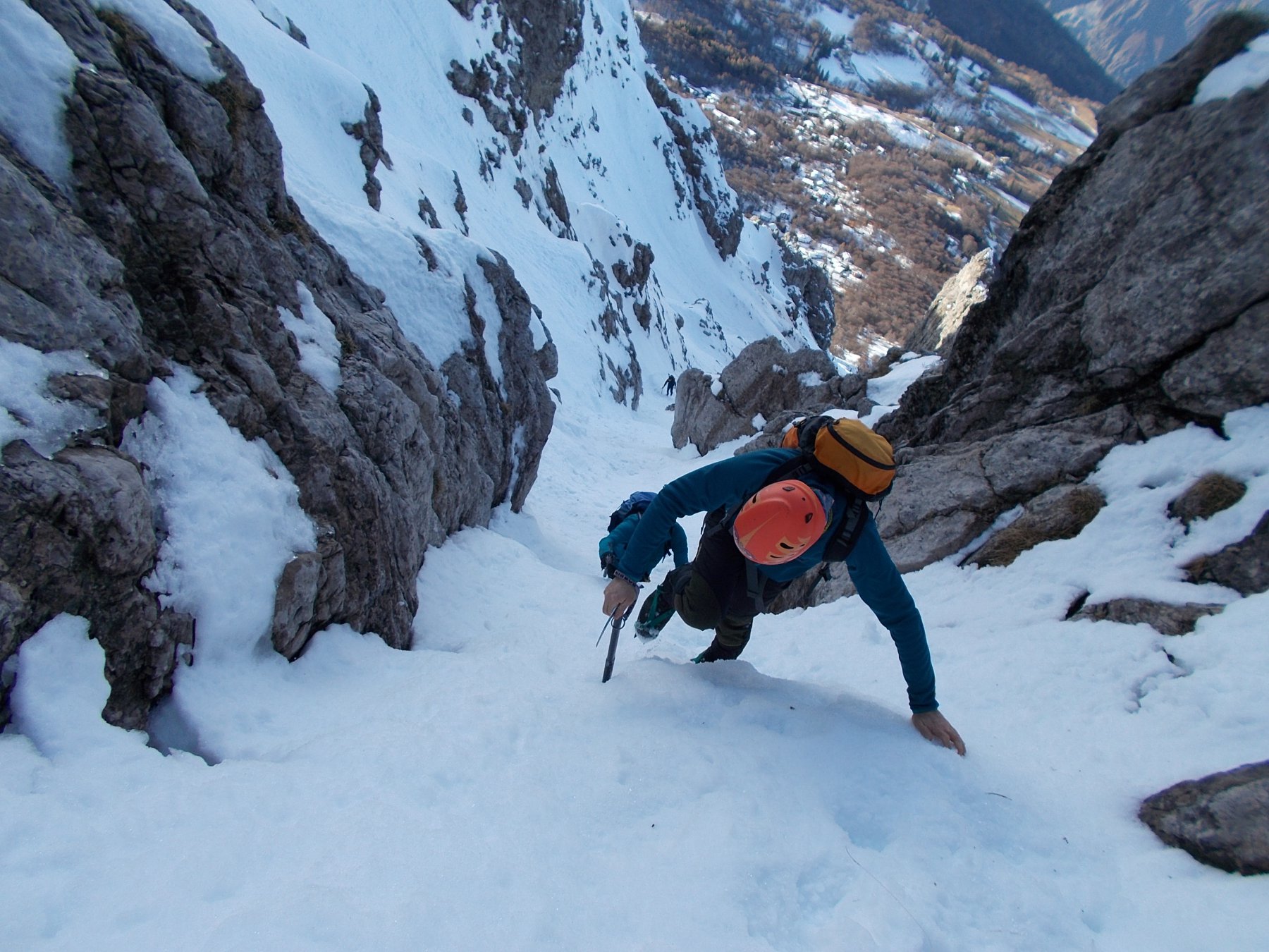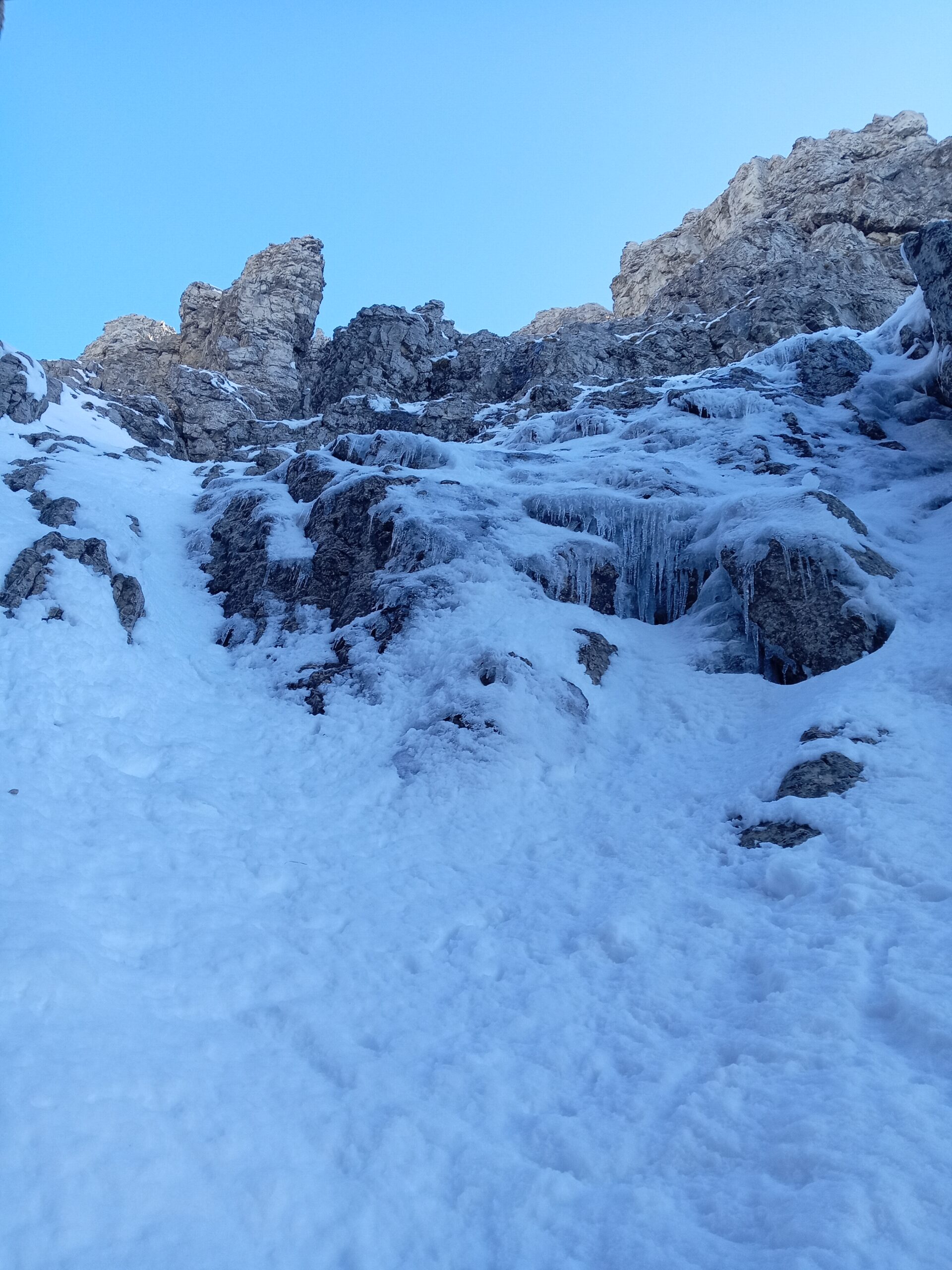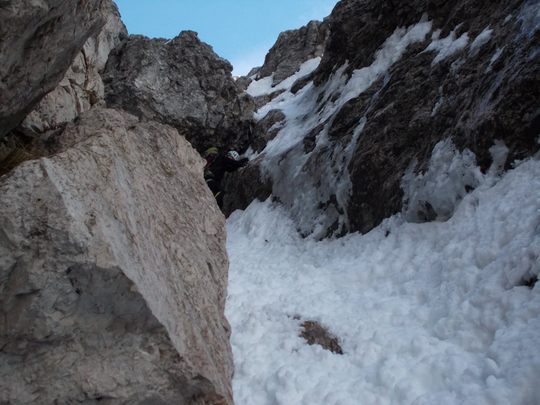 Dopo un primo breve tratto non particolarmente ripido si supera sulla destra un masso incastrato (ghiaccio o roccia). Poco oltre si supera ancora sulla destra un altro salto roccioso (che eventualmente è possibile aggirarlo spostandosi di qualche metro verso destra).