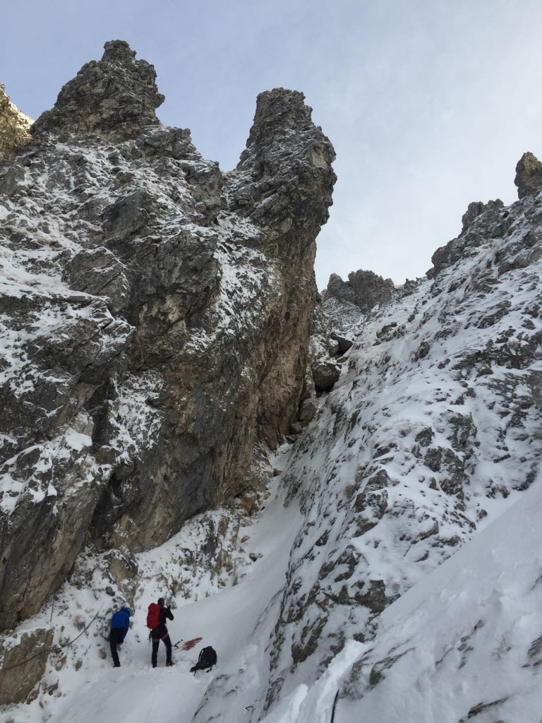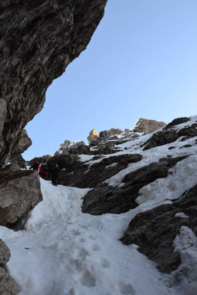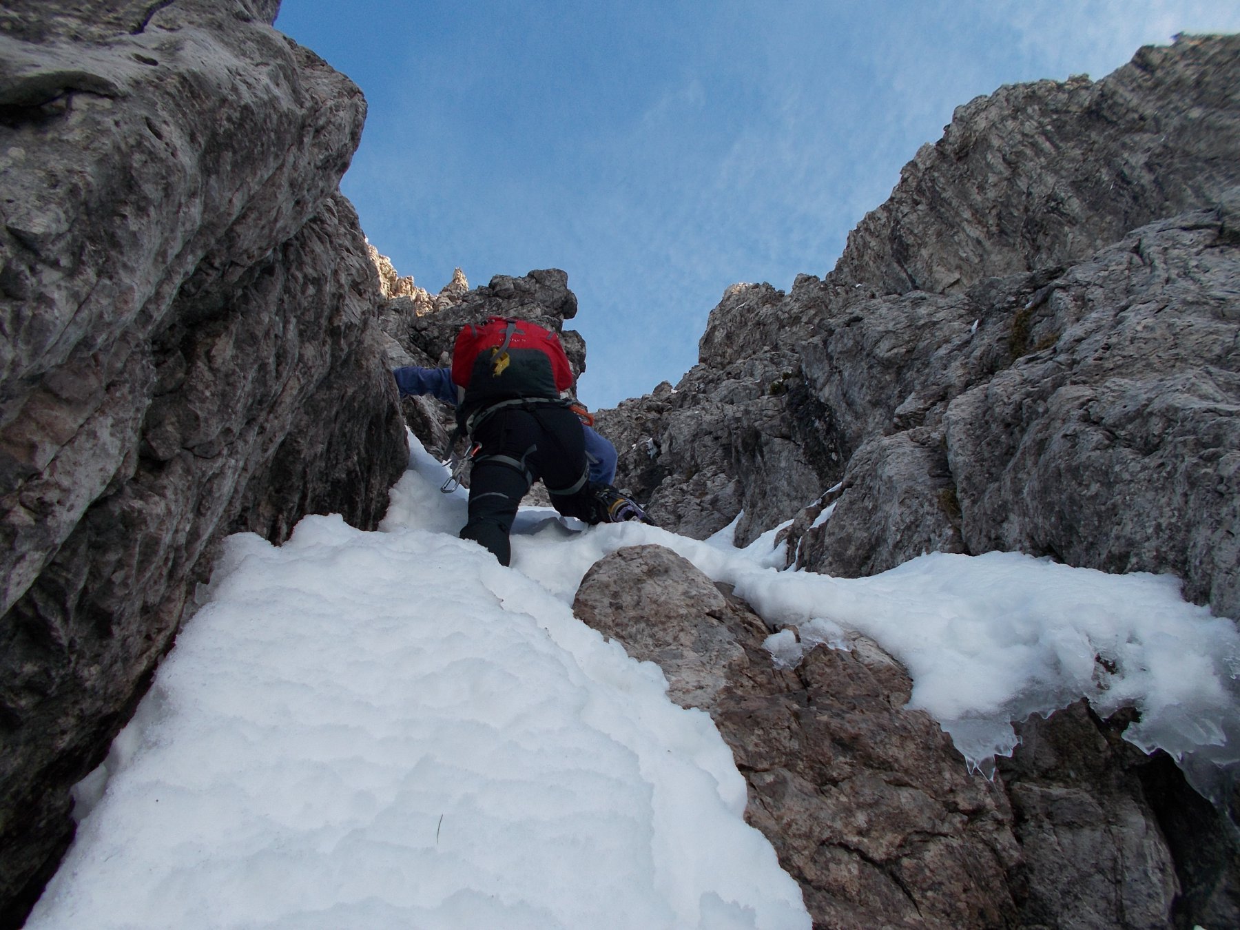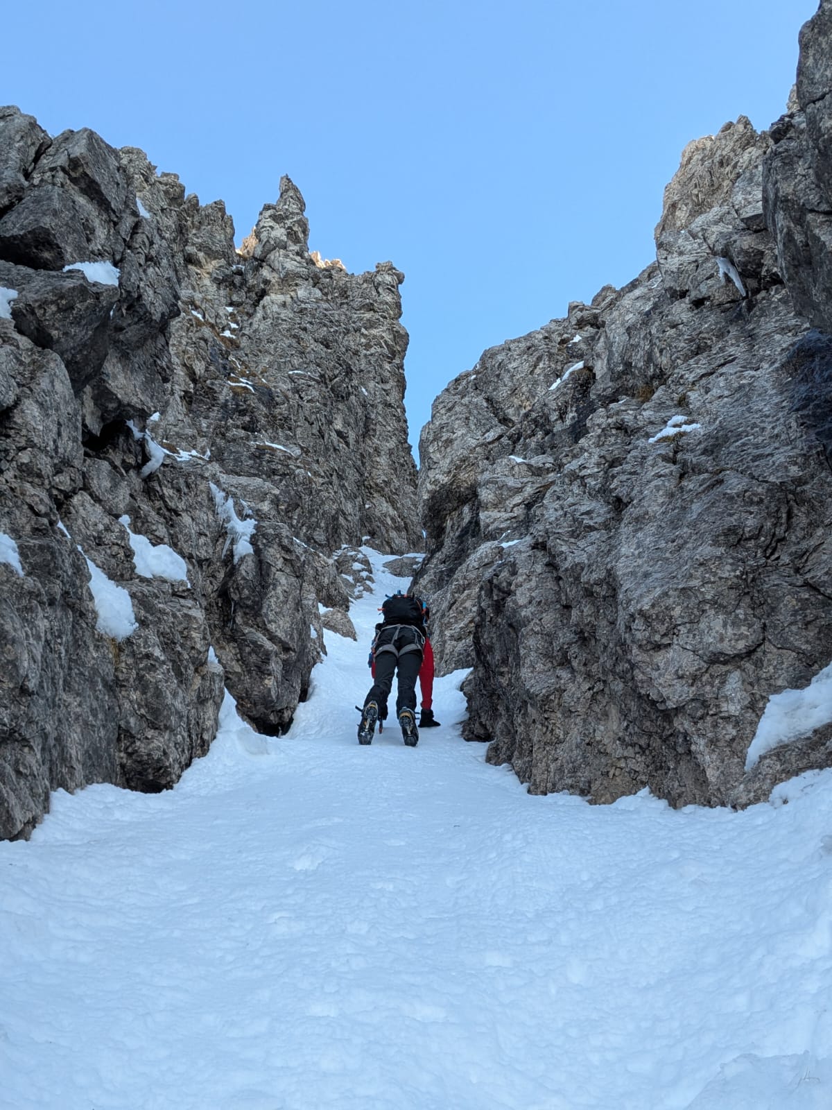 Dopo un primo breve tratto non particolarmente ripido si supera sulla destra un masso incastrato (ghiaccio o roccia). Poco oltre si supera ancora sulla destra un altro salto roccioso (che eventualmente è possibile aggirarlo spostandosi di qualche metro verso destra).