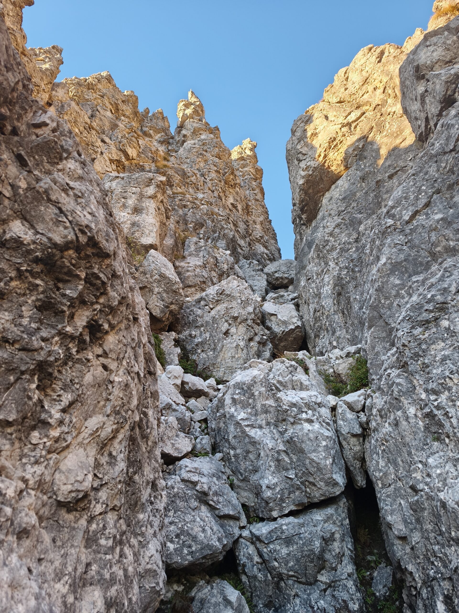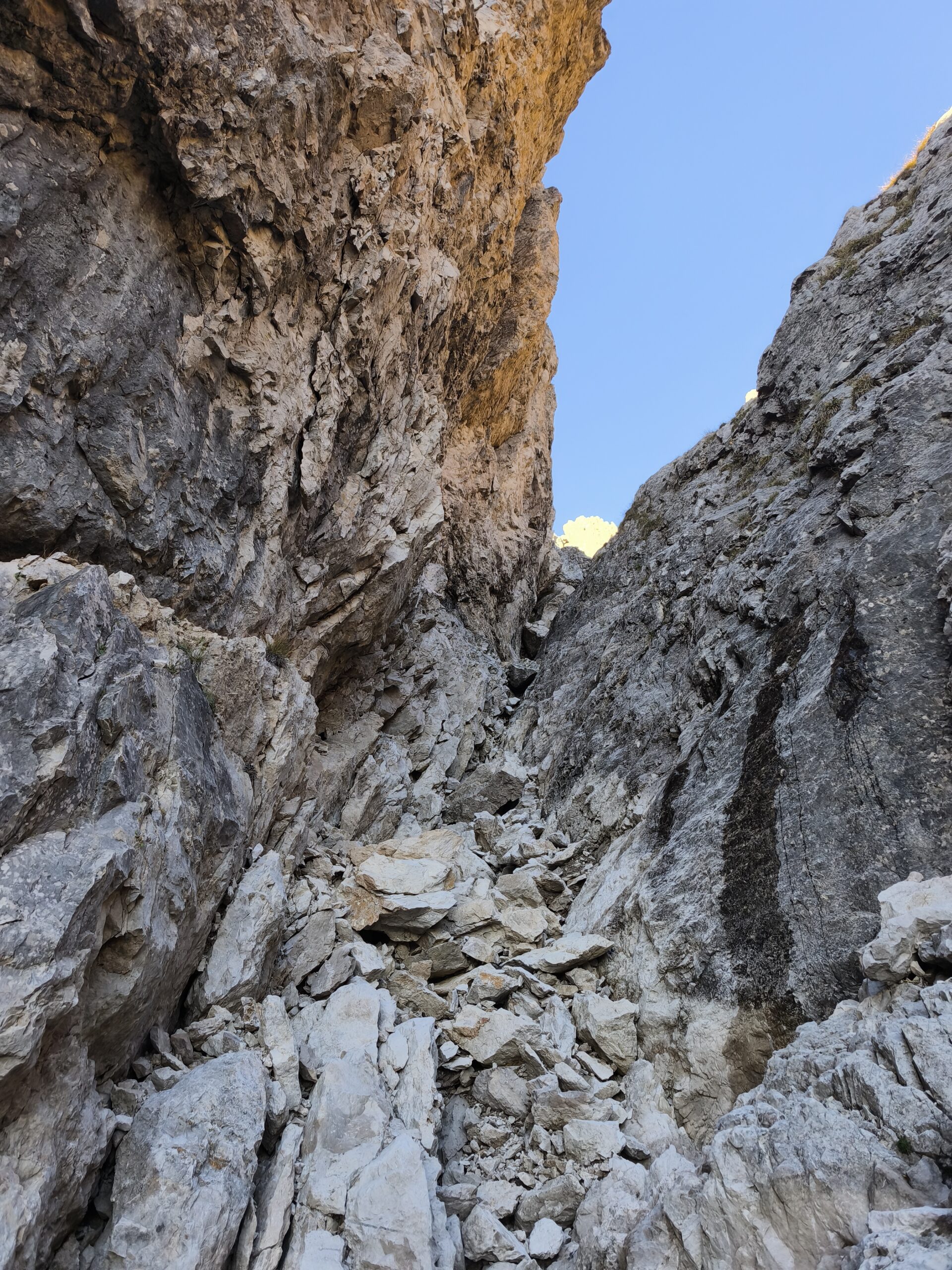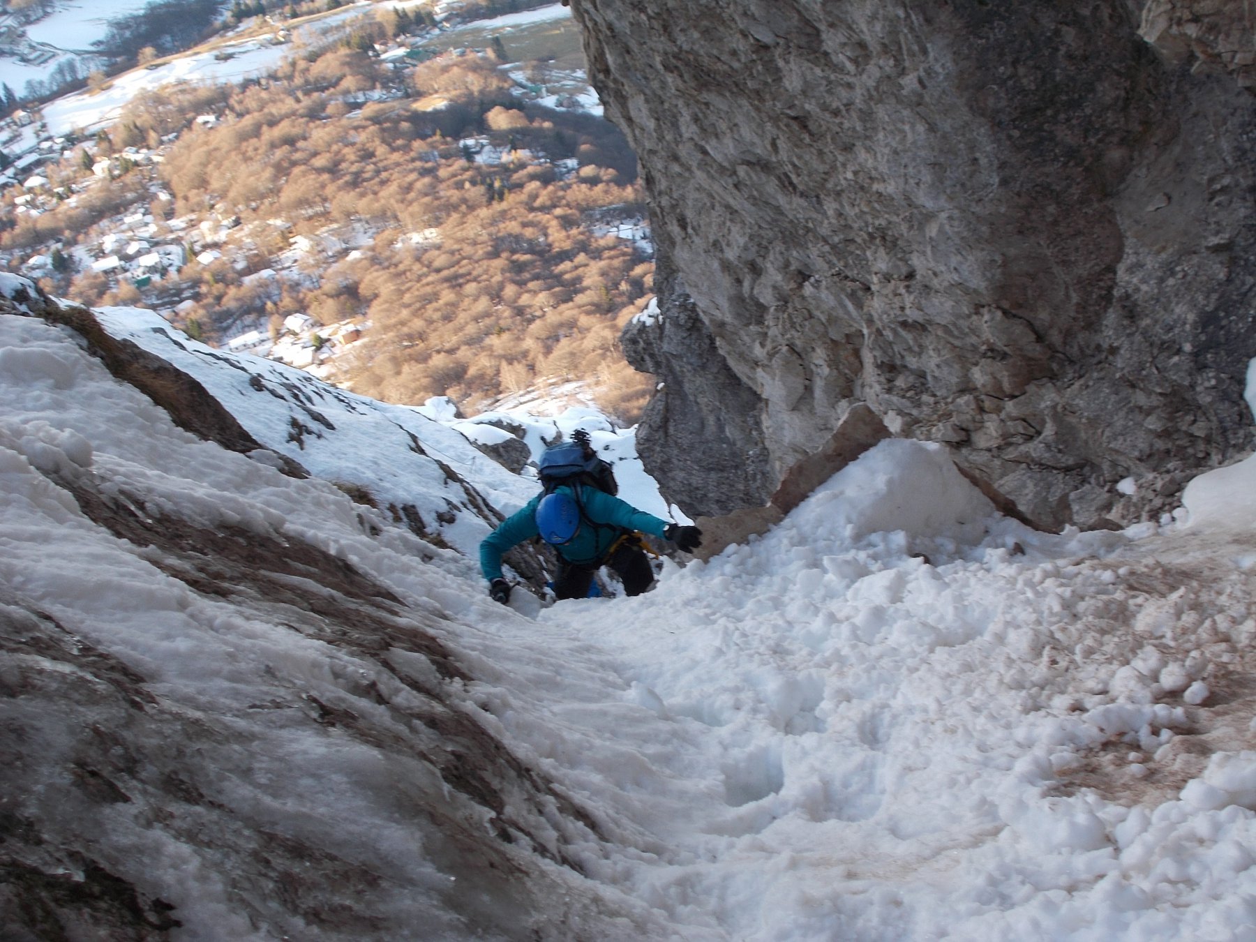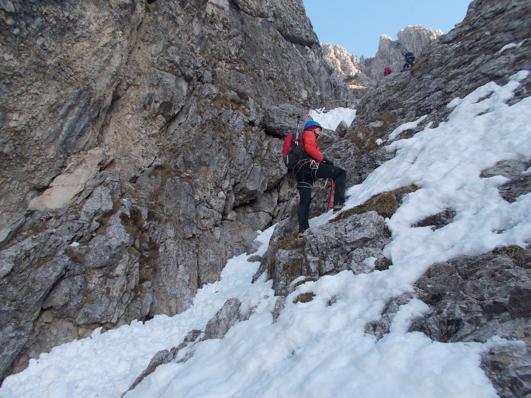 Dopo un primo breve tratto non particolarmente ripido si supera sulla destra un masso incastrato (ghiaccio o roccia). Poco oltre si supera ancora sulla destra un altro salto roccioso (che eventualmente è possibile aggirarlo spostandosi di qualche metro verso destra).