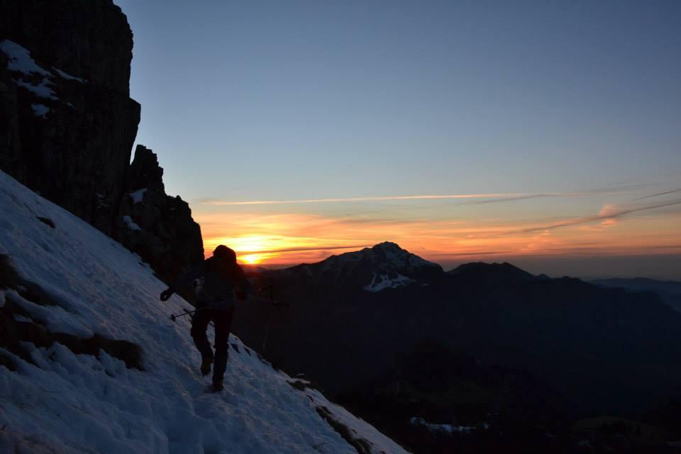 Il parco giochi dei lombardi con la passione per la montagna si chiama Grignetta. Le condizioni sono ottimali: ottimo rigelo, canale già scaricato, traccia presente, attacco chiaro senza possibilità di errore. Partiamo alle 7.10 dai Resinelli e con calma ci avviamo verso l’attacco del canale seguendo il sentiero 8 della direttissima. Questa traccia prosegue in direzione W, con una serie di tornanti e lunghi tratti a mezzacosta. Sono presenti consistenti residui di slavine dei giorni scorsi. Abbiamo indossato i ramponi per alcuni traversi ripidi, esposti e ghiacciati. Mentre Davide perde il casco facendolo volare giù a picco in un canale ci gustiamo un’alba infuocata. Arriviamo facilmente alla scaletta del caminetto grazie ad alcune catene fisse che proteggono un traverso vertiginoso. Subito prima della scala c’è l’attacco del canale. La parte iniziale è stretta e subito vi è un passaggino su roccia (probabile 2-), poi il canale si allarga e scende di pendenza. Più sopra vi sono due tratti più ripidi, circa 50°, la neve abbondante ha nascosto gli altri due tratti di arrampicata. In questi punti abbiamo trovato neve davvero dura. Verso l’uscita occorre aggirare un masso tenendoselo a destra, questi ultimi metri sono ben oltre i 50°. Dalla cornice si sbuca sulla Cermenati a quota 2020m e poi in un attimo in vetta. Ambiente e panorami della Grignetta al solito fantastici. Giornata limpidissima, calda ma non troppo e affollata as usual. Discesa dalla Cermenati facile ripida e veloce. Con Davide.