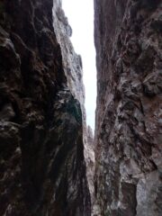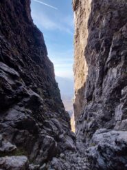 Da qui ci si cala 45m (spezzabile) nel freddo canale del Fungo. È possibile calarsi anche dal camino percorso durante la via se si volesse velocizzare, attenzione al recupero delle corde in questo caso.