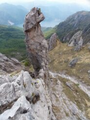 - L2: Salire una fessura con passo ostico, portandosi sul versante Ovest dove con un traverso delicato ma ben protetto si giunge alle ultime appigliate roccette che portano in cima al Fungo. Comoda sosta su resinati. (30m, IV).