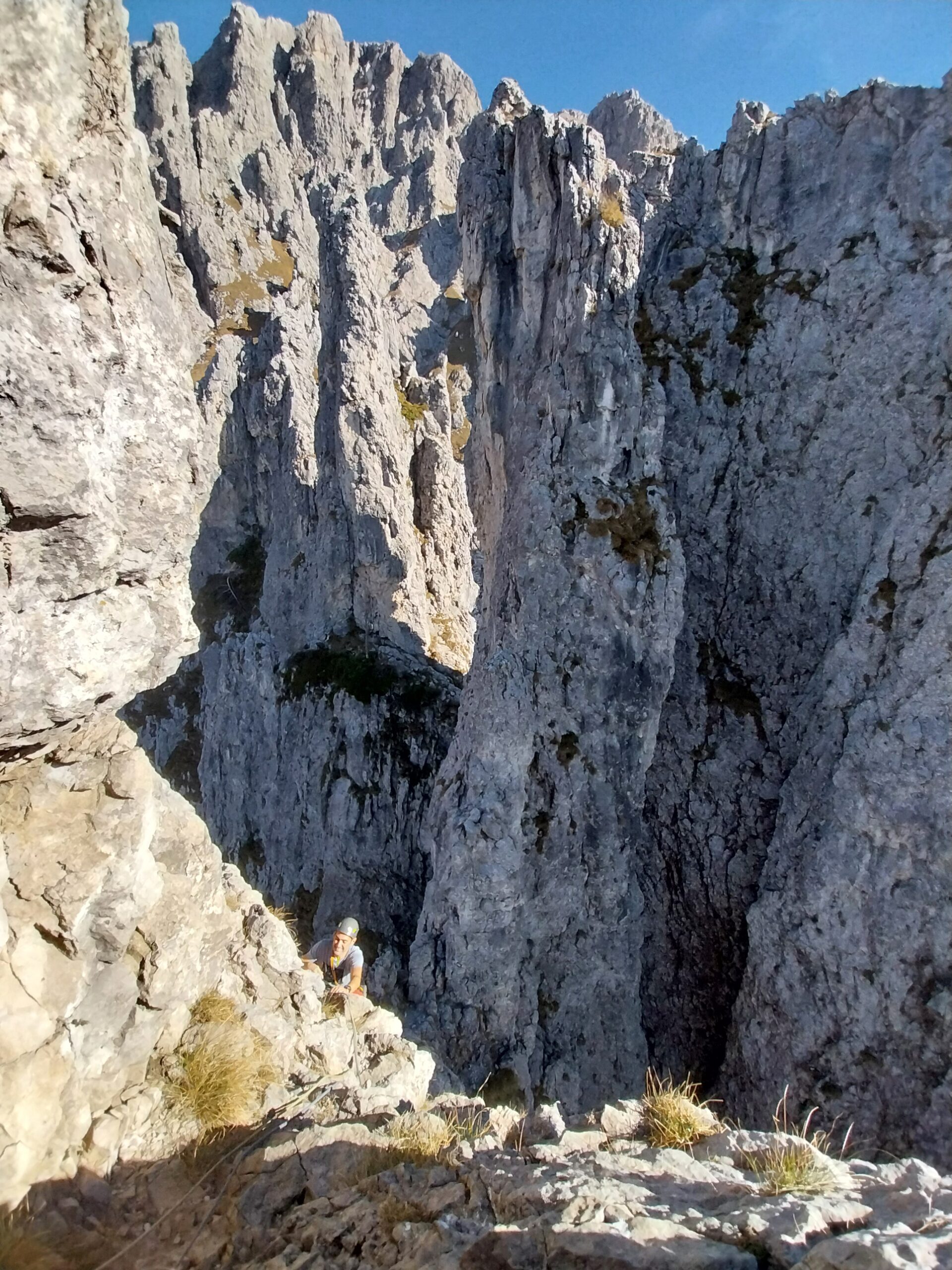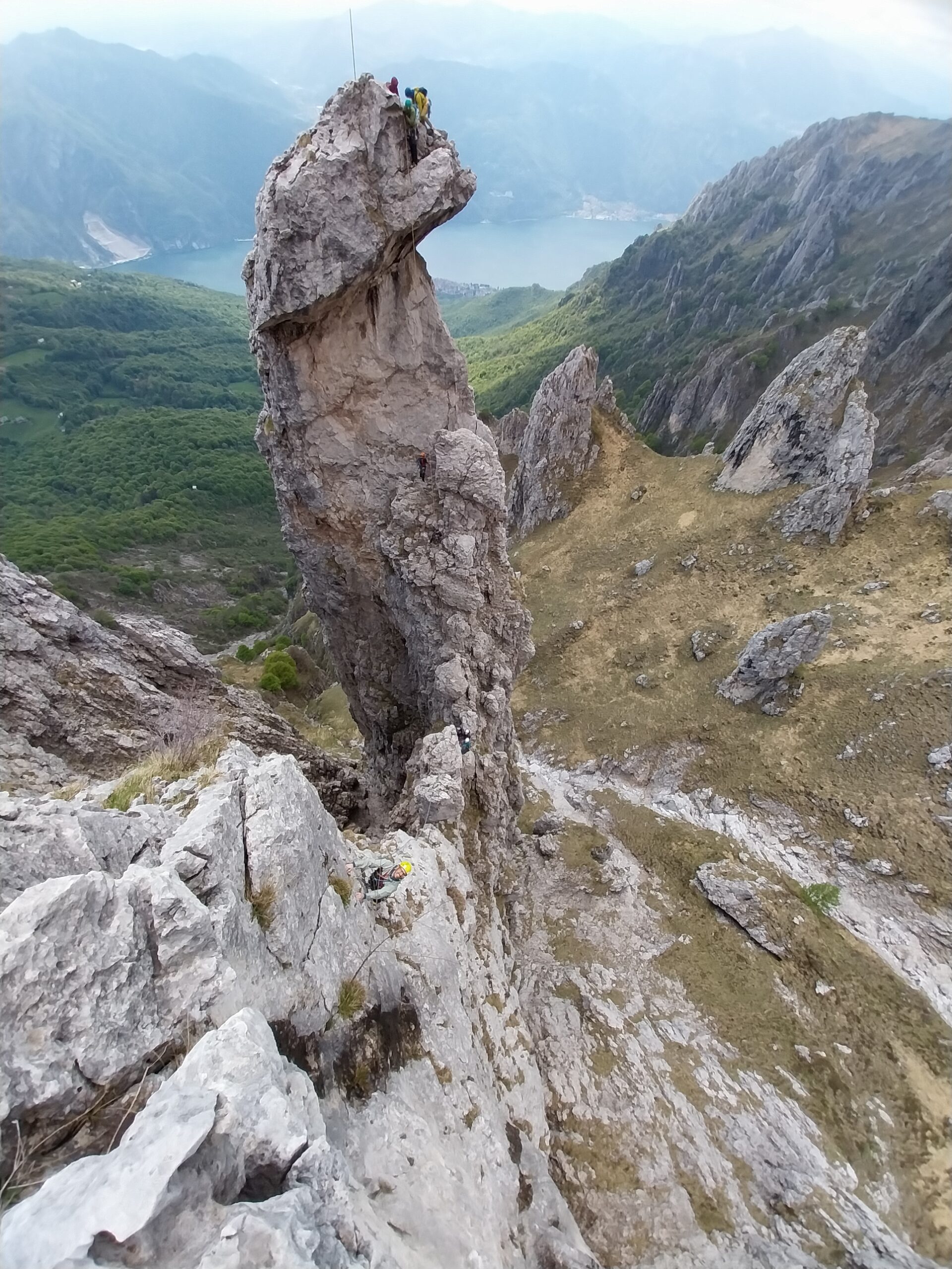Dalla vetta spostarsi verso il versante nord e effettuare una calata di circa 30 m. (la prima parte nel vuoto). Attenzione nella seconda parte della calata a non pendolare dalla crestina verso il canale. Alla sosta saltata durante L1 parte la via Accademici (resinati con cordone).