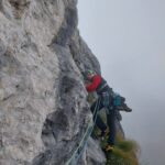 2: Guardando la Torre si fa un passo delicato in traverso verso destra, poi per sentiero fino alla forcella sulla cresta della Torre con sosta di calata. (25m, III).