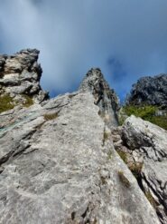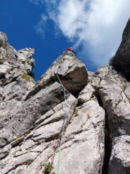 Una doppia da 25 porta ad un ripiano sottouno strapiombo dove attacca la via.