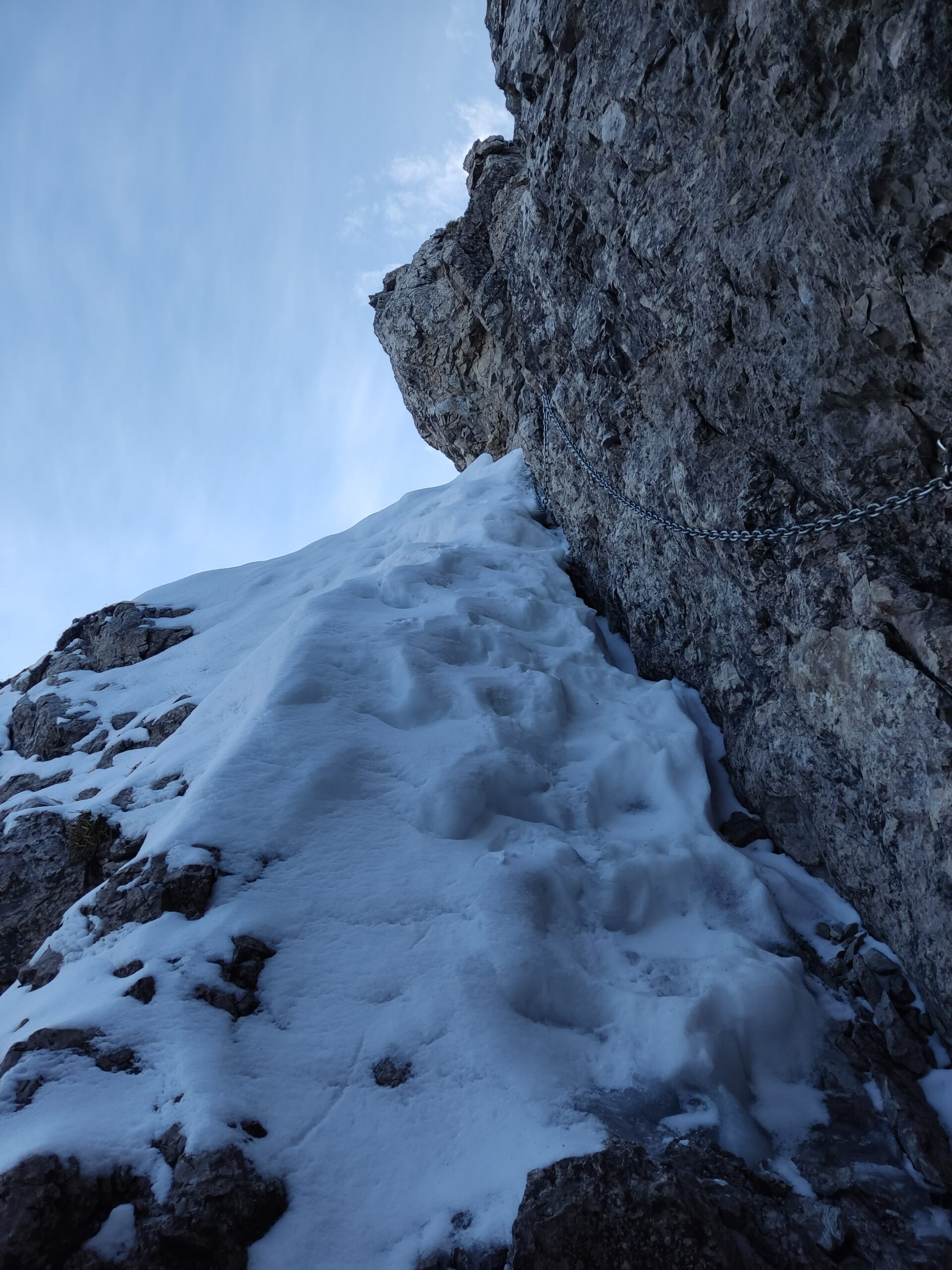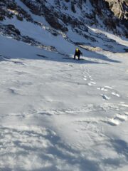 fin qui tutto pulito,poi su neve quasi continua fino all’uscita del canalino della Federazione,ramponi obbligatori nel complesso bella gita ancora in dondizioni invernali.