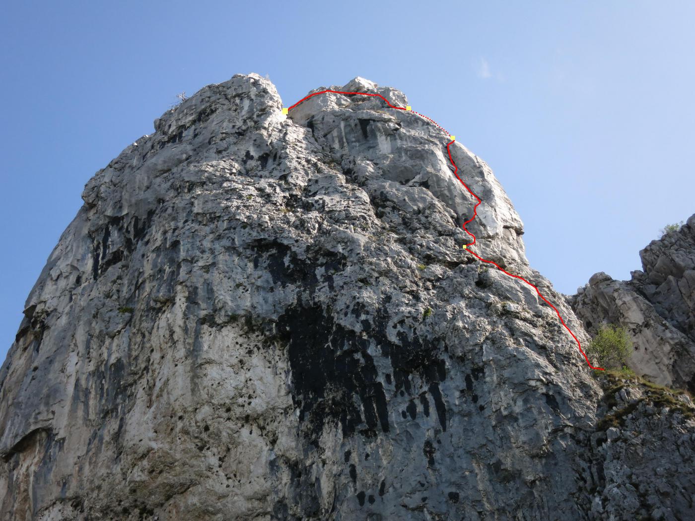 - L3: 5b 35m; superare un primo strapiombino poi seguire lo spigoletto fino a puntare la catena che si raggiunge con un passaggio esposto.