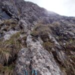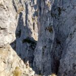 - L1: 4c 35m; Seguire un’evidente fessura da abbandonare sulla destra appena prima della fessura leggermente nascosta.