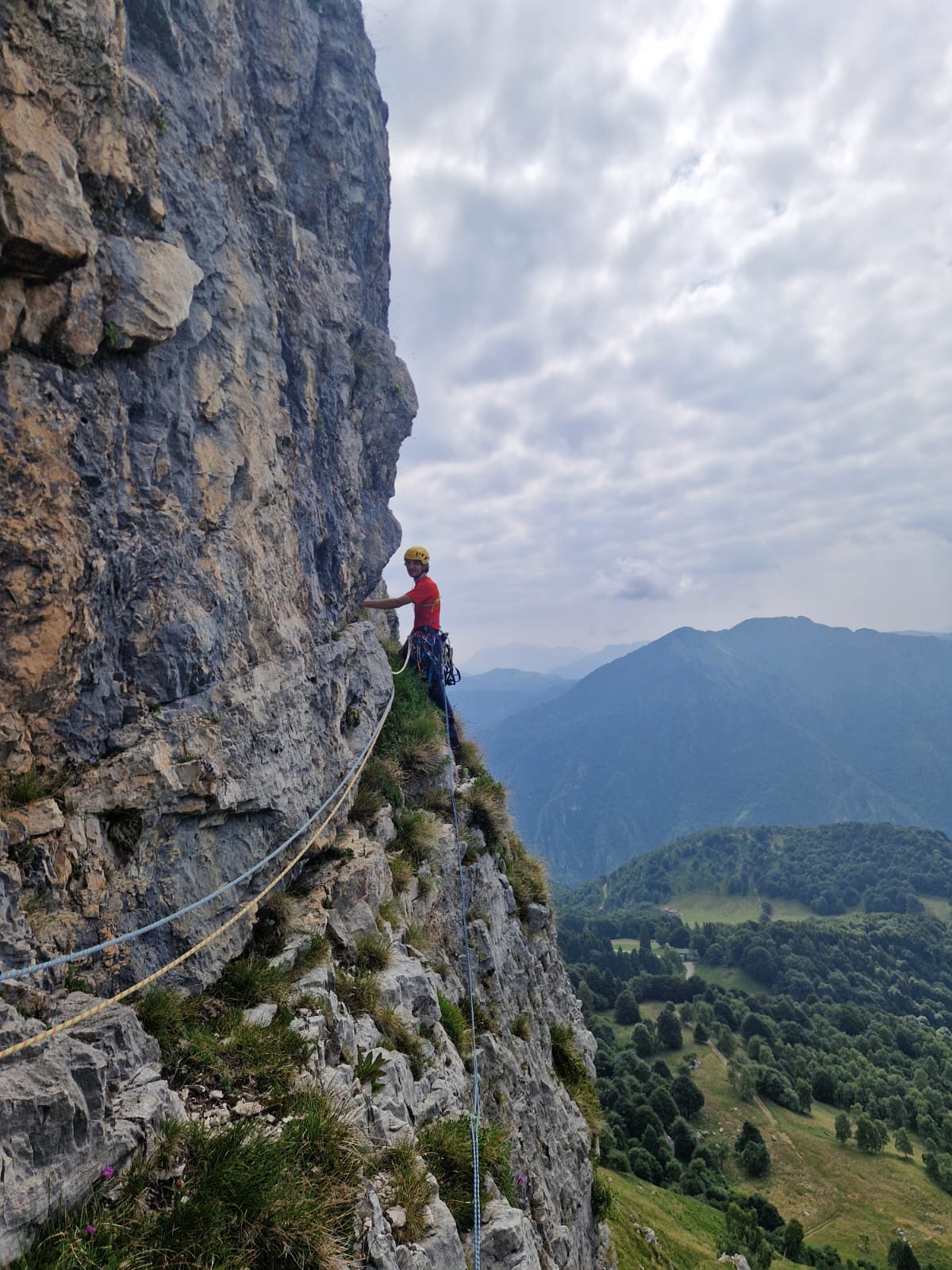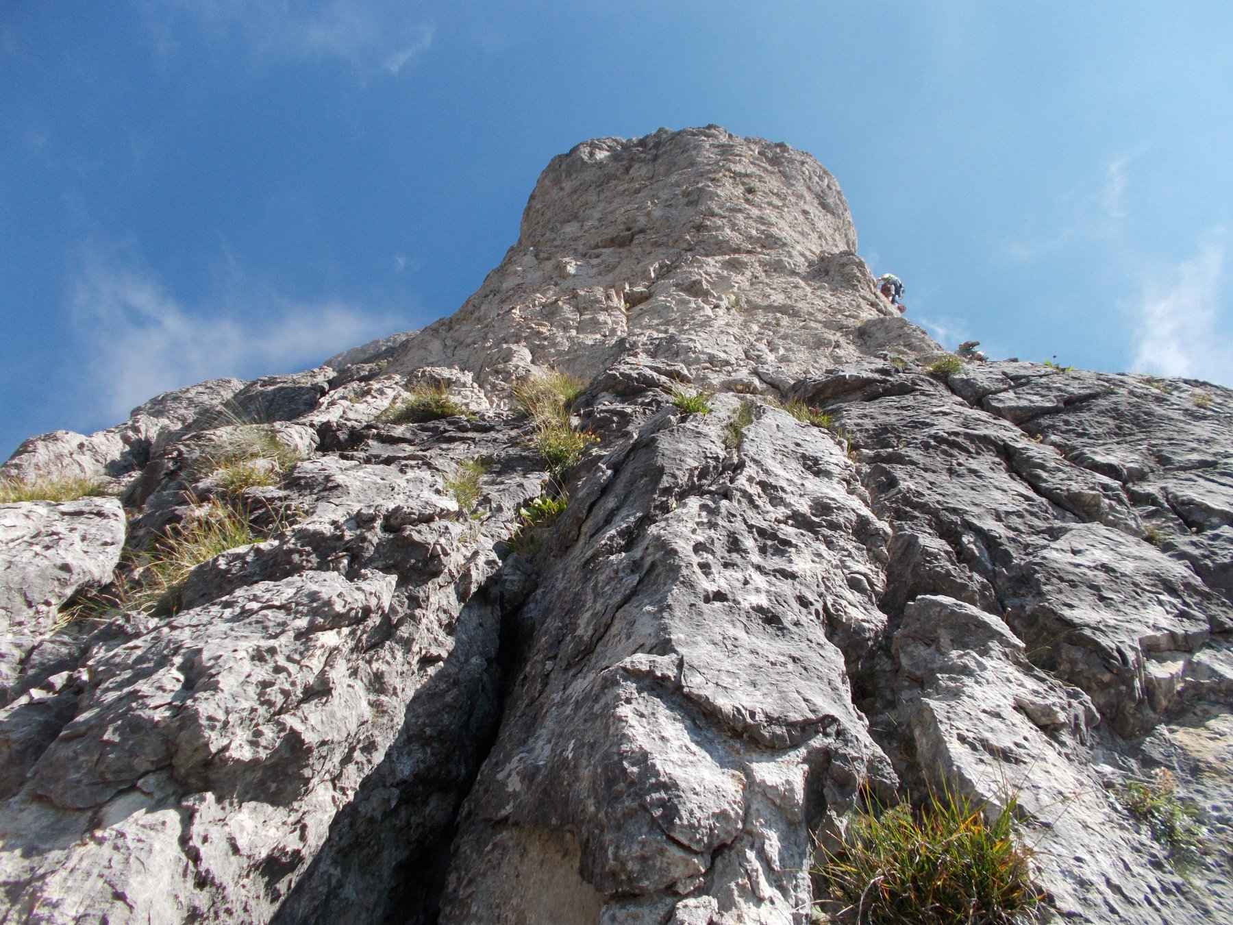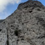 L2:traversare decisamente a destra per cengetta e passato lo spigolo salire all’incirca in verticale (1 chiodo) e poi puntare allo spigolo destro della parete, sosta su 2 chiodi sotto un saltino verticale. III e V. Poco proteggibile.