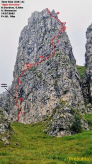 L1: partenza per evidente diedrino fessurato giallo lato parete che guarda i resinelli (1 chiodo un pò in alto sulla parete destra). Poi cengetta e leggermente a sinistra in A1, 1 chiodo nuovo e 1 chiodo vecchio con anello. Poi per paretina friabile non proteggibile fino alla cengia. Sosta sulla destra su fix del 12 con anelli. V+/A1 e V.