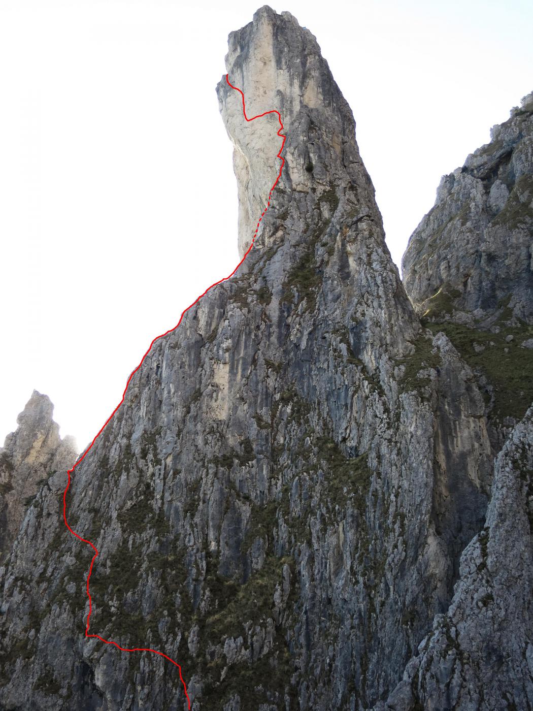 Lo zoccolo è infestato dalle zolle e non è per niente facile e fin che si può è meglio tenere le scarpe di avvicinamento, non banale anche il tiro che precede la lunghezza chiave. In questa parte del percorso abbiamo trovato in tutto due chiodi e uno spit 8mm(?).