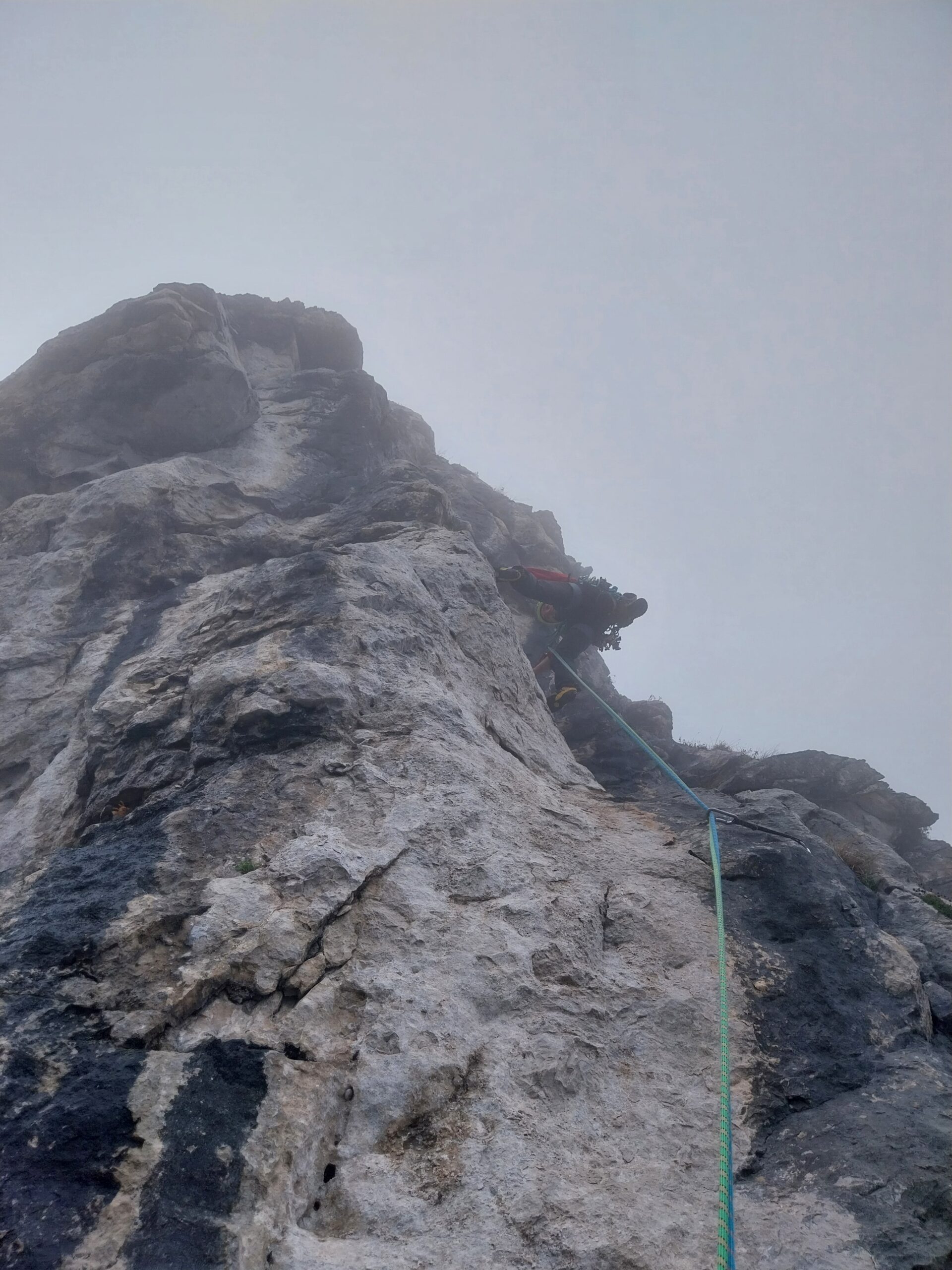 Una delle ultime vie (almeno, di quelle a resinati) che mi mancavano nella zona del Fungo, mi avevano avvisato che non era per niente banale e in effetti L1 ci mette a dura prova…contando anche che salita la nebbia il freddo alle mani si è fatto sentire non poco. La linea è abbastanza forzata (a destra ci sarebbero rocce più facili ma più erbose) e i passaggi non sono tutti azzerabili, ma comunque con un po’ di perizia Teo esce bene in sosta dove lo raggiungo. Secondo tiro fatto concatenato a differenza di ciò che dicono le relazioni, basta evitare di rinviare la sosta e andare direttamente al resinato sopra (tanto si è appena sopra al terrazzo). Discesa con una doppia con cordoni e maglia rapida su spuntoni ancora in ottimo stato, 40m o anche volendo 30m se si liberasse sul ripido prato.