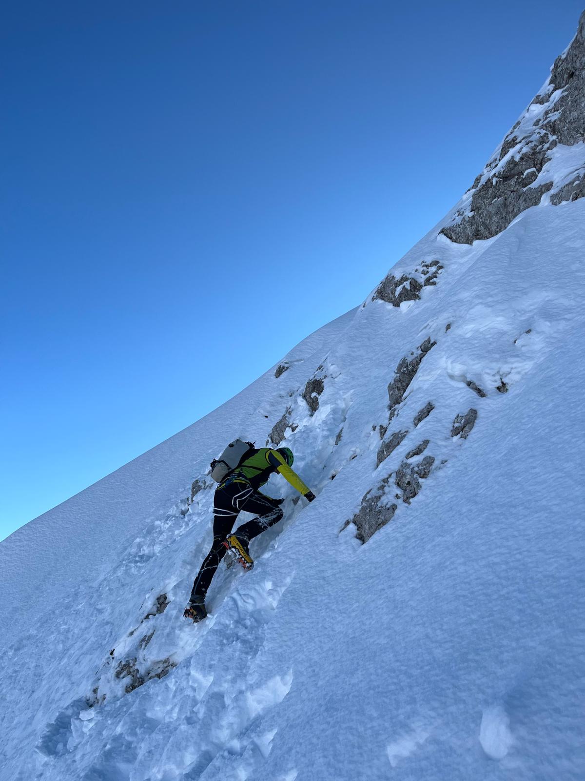 Bellissima cresta mai banale in un ambiente stupendo! La nevicata di ieri la resa faticosa almeno per me e Matteo che abbiamo battuto la traccia, da metà in poi invece c’era ancora la traccia di chi è passato settimana scorsa. Al momento la neve ha rigelato solo in pochissimi punti, il resto inconsistente.