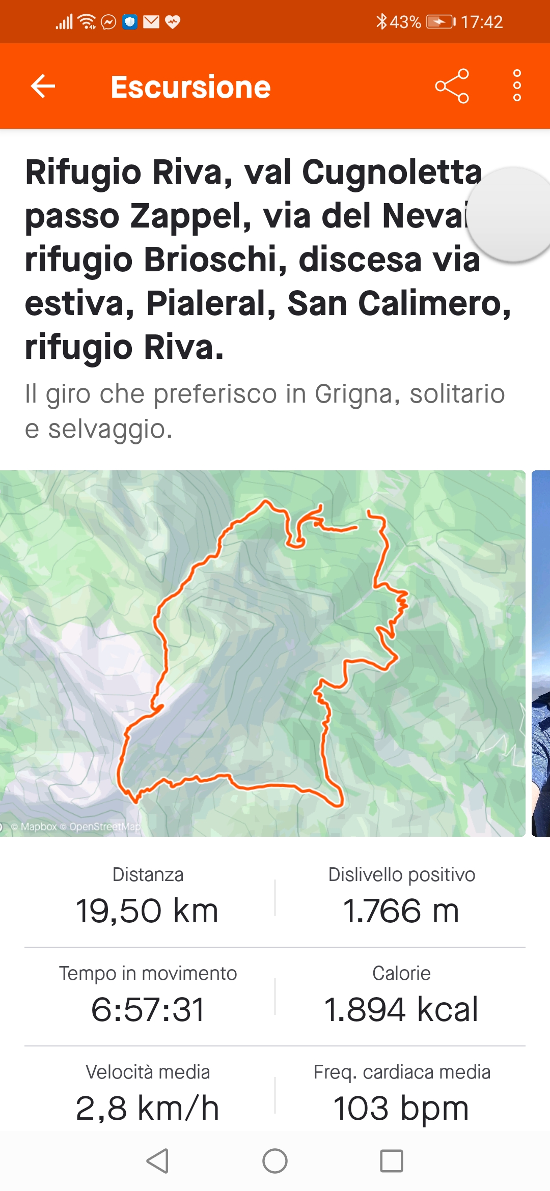 Dal rifugio Riva per la val Cugnoletta fino al passo Zappel poi via del Nevaio, che non c’è più, cresta e cima del Grignone, discesa dalla via estiva Pialeral, San Calimero e ritorno al rifugio Riva. Salita in assoluta solitudine nella selvaggia valle, avvistata la coppia di aquile e un grosso branco di camosci. Parecchia gente in vetta. Ottimi gnocchetti pizzocherati al Brioschi. Attenzione al bivio dopo il Riva, non prendere il primo ma passare la casina e prendere il successivo, prendendo il primo il sentiero è nascosto da alberi caduti e arbusti, gran ravanata per ritrovare la via. Circa 20 km con quasi 1800 metri di dislivello.