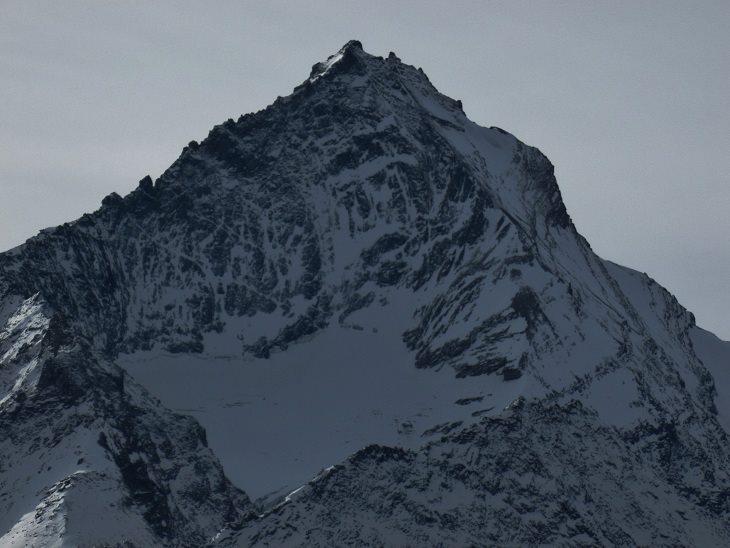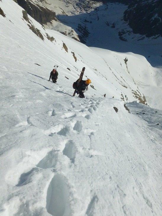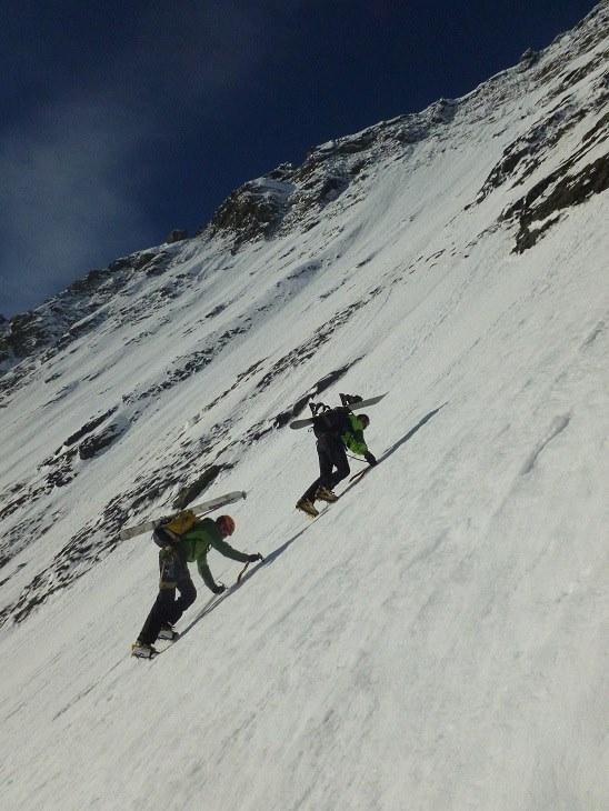 Gita in compagnia di Alain-Diego Flowered. Saliamo al bivacco a un’ora immonda e lo raggiungiamo alle 22:30 circa. Nel locale invernale troviamo CriBot, BumBum e Davide. Stessa idea. Comune obiettivo. La sveglia non suona: la metti tu, la metto io, quella di BunBum è maffa. Alain mi dice “Sbo! sono le tre e mezza!”. Io non rispondo, ma accendo la frontale. Oggi non sono in forma. Una brutta tracheite mi fa respirare male. Prepariamo il te, poi un pò di pane e marmellata. Ci si veste e poco dopo pestiamo, alla luce delle frontali, la neve poco rigelata. Lascio andare gli altri che con gli sci, scivolano appunto, e hanno un passo rapido. Io sprofondo e fatico. Ci ritroviamo tutti alla base del pendio. Superiamo la terminale facilmente e siamo in parete. Il sole la illumina e lei brilla luccica, quasi abbaglia. Ci altreniamo nella traccia, ma dopo un pò devo cedere il passaggio. Non respiro. Cioè lo faccio malissimo. Tossisco! Allora prendo un passo lento e lascio il lavoro sporco al trio BB/CB/AFlow. Finalmente in vetta. Bella, stretta! Quasi a rispettare un cliche, uno stereotipo: le montagne sono a punta. Appunto! Una croce in ferro, “minimalista”, discreta, decreta ufficialmente che quella è la cima! Foto di rito e poi calziamo gli attrezzi da scivolamento e uno alla volta raggiungiamo il versante NE. Primi metri intensi, qualche curva. Poi il pendio va sui 50°, si allarga e la neve consente di sciare bene. Ci si alterna e arrivati al “mitico” traverso ho come una visione: Stefano che nel lontano ’79 si accinge a superarlo. Per un momento sono come rapito da questa immagine…poi sono io che traverso…chissà quale emozioni avrà provato…era il primo…c’era il mistero…essere lì dove nessuno aveva mai sciato, realizzare un sogno…chissà?..