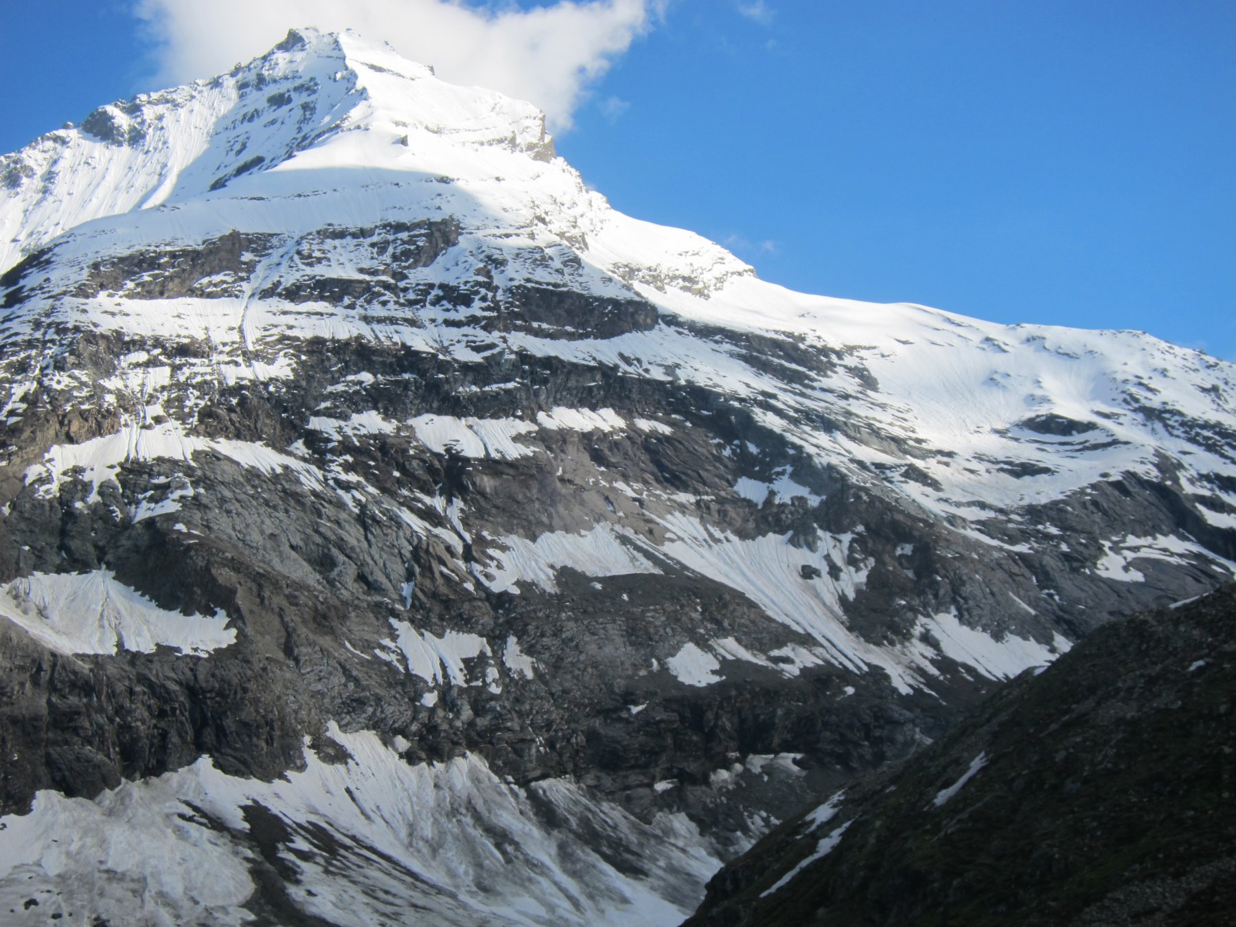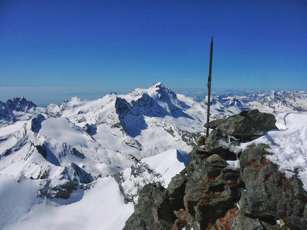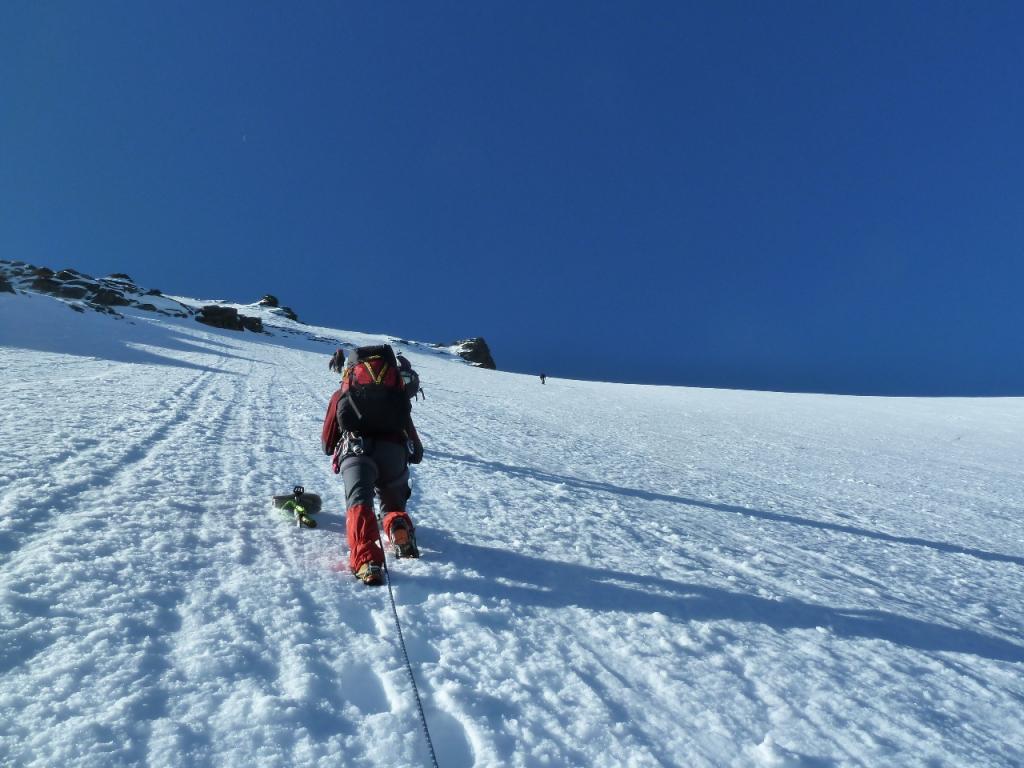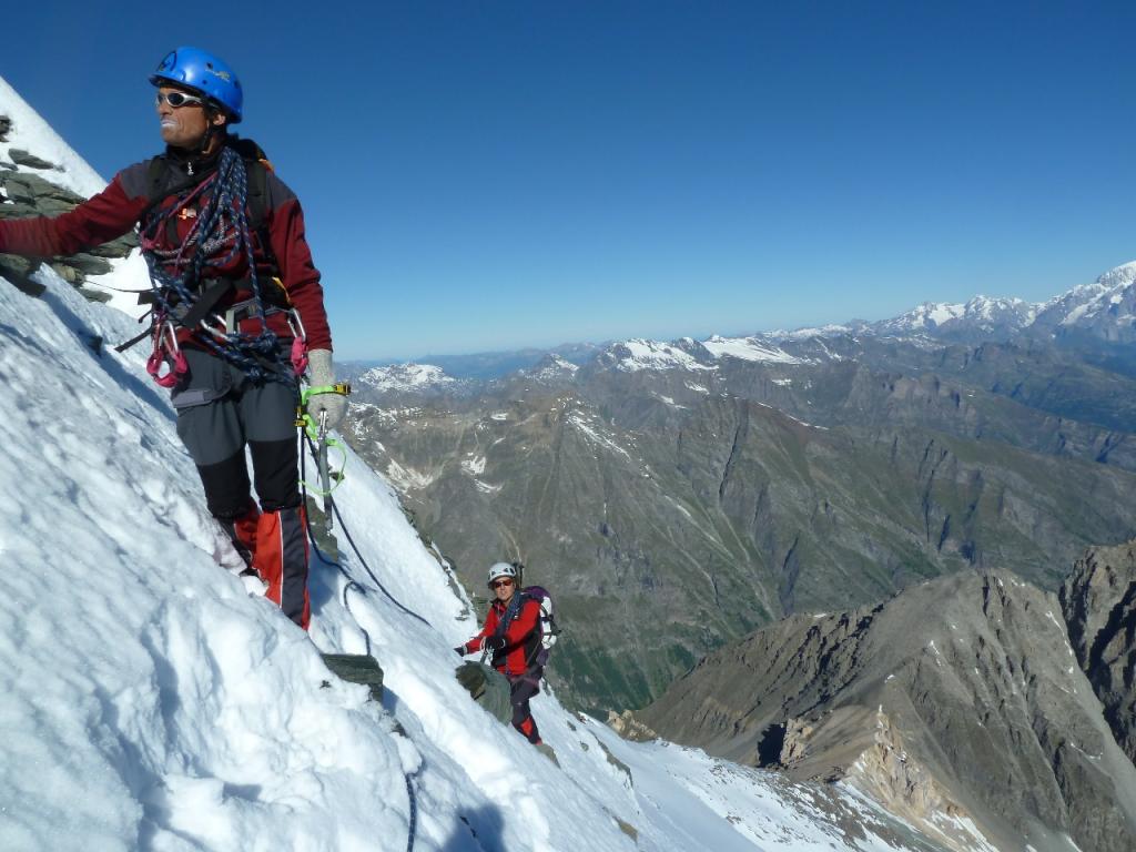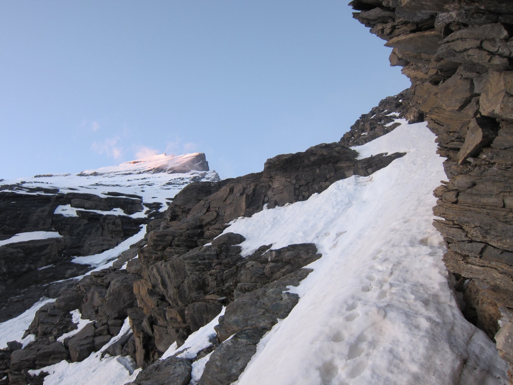 Allego tra le foto la scansione della relazione del citato libro di Grassi che è tuttora valida, sebbene il percorso migliore, quasi mai obbligato, sia da ricercare secondo le condizioni della parete. Noi abbiamo iniziato la salita per una lingua di neve che scendeva continua fino in fondo al vallone che conduce al Col di Belleface, a quota 2700 m circa, traversando poi progressivamente verso sinistra. Partiti dal bivacco alle 3,45, alle 9 siamo giunti in vetta.