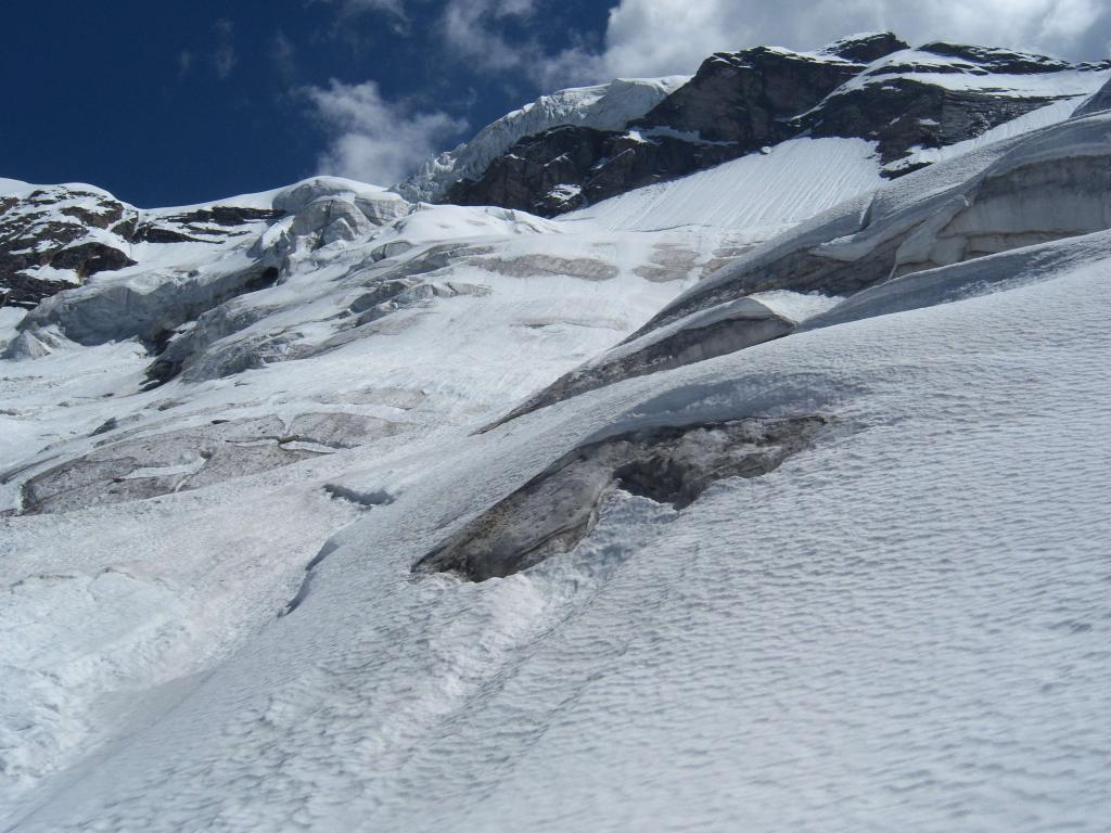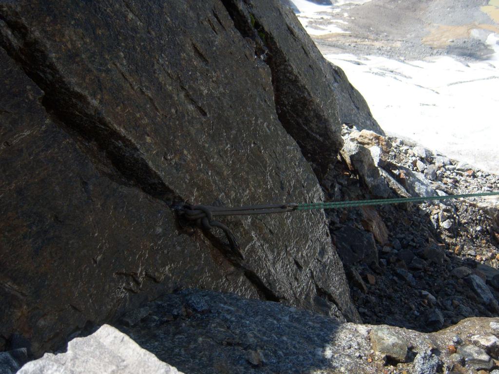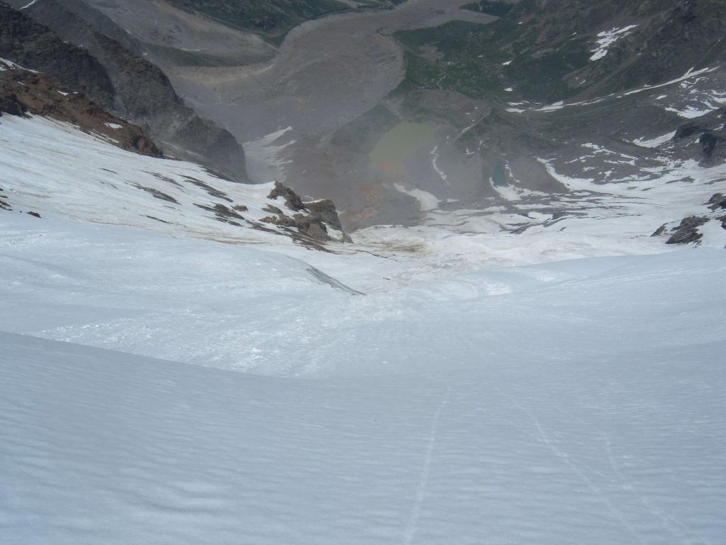 Ci si tiene dapprima sotto la parete della Punta Tre Amici e, dopo aver lasciato sulla destra una fascia di crepacci, ci si sposta progressivamente verso destra fino a giungere alla bastionata rocciosa a fianco della quale si trova il canalino Pisati. Scendere mantenendosi inizialmente vicino alle rocce e poi proseguendo dritti in basso verso il ghiacciaio sottostante (un paio di chiodi sul posto, molto utile una calata in corda doppia).