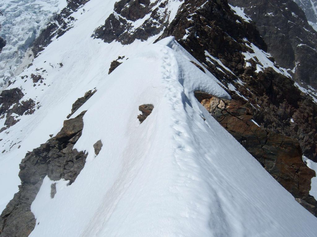 Poco sopra la terminale si affronta una fascia rocciosa (III grado) non difficile ma poco appigliata (un chiodo a metà fascia), e si attraversa poi verso sinistra il vallone soprastante fino a raggiungere la cresta. Inizia qui la parte più estetica dell’ascensione, seguendo fedelmente l’ampio filo di cresta con diversi saliscendi e giungendo senza difficoltà in cima.